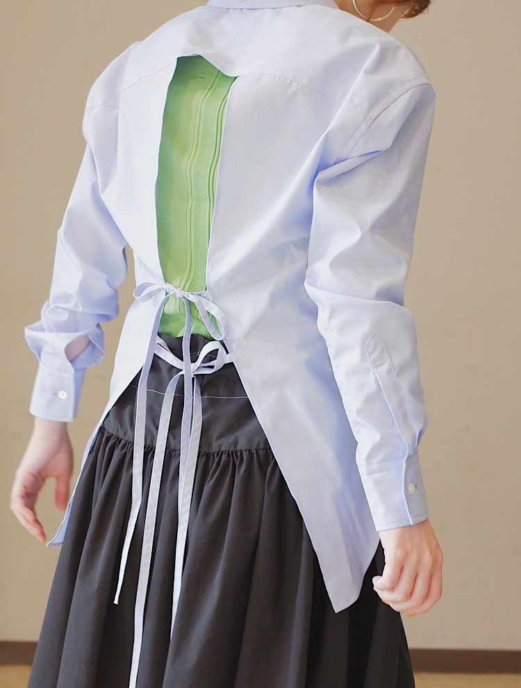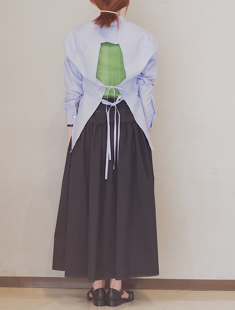 ハリ感のある素材で、きちんとしたシルエット。背中の開きが可愛いのでインナーを色々変えて着ていただけます。