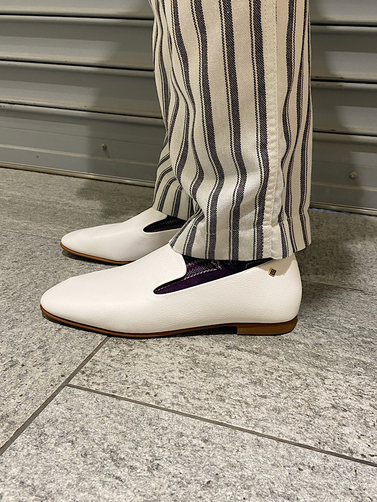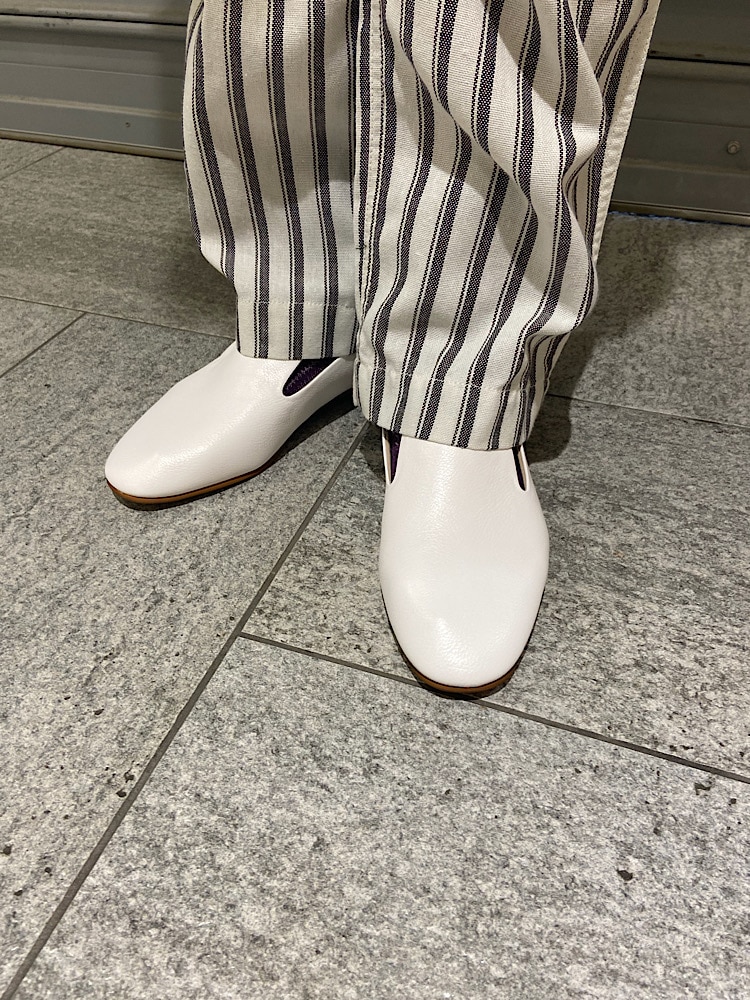 【素材感・着心地】キレイなストライプ柄が特徴のイージーパンツ。ストライプはシルエットはがキレイに見えやすいので、キレイめな合わせにも活用できる。