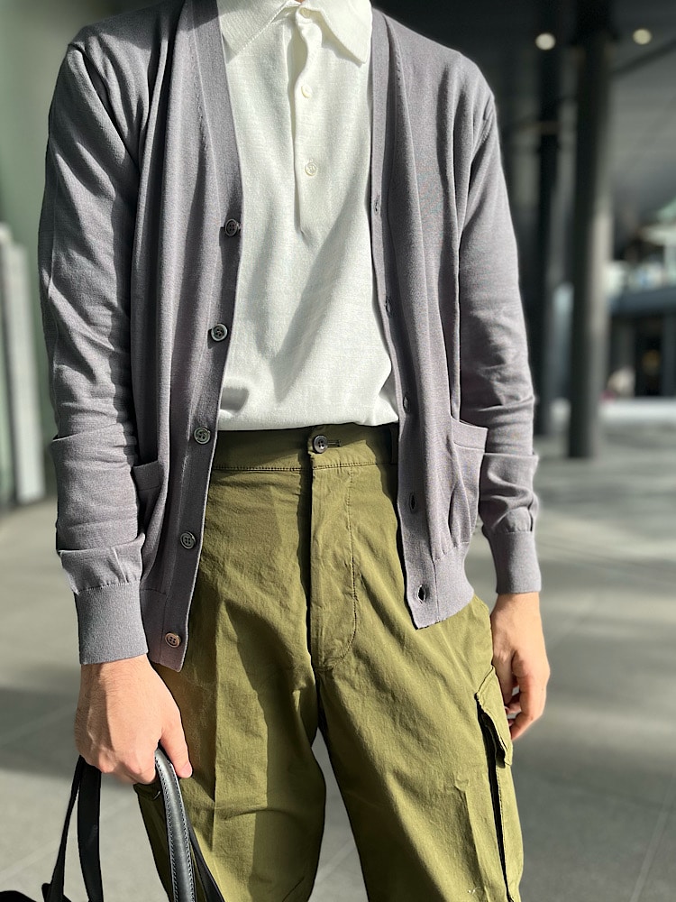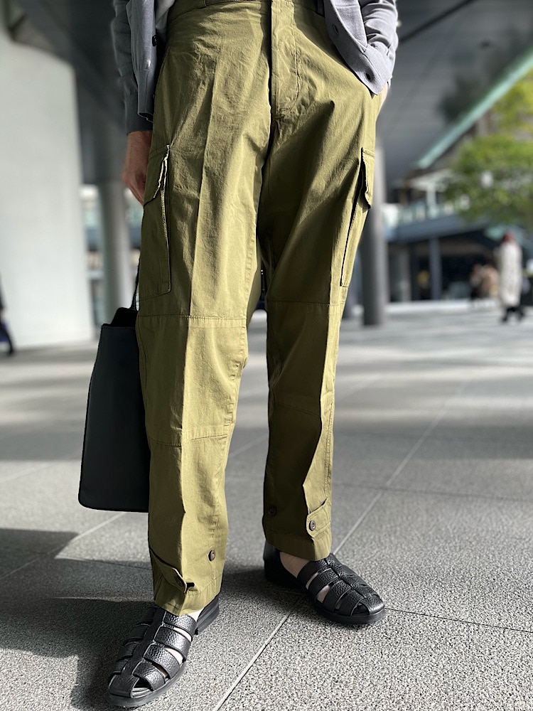 肌触りの良いニットとドレス顔のカーゴが入荷しております。足元もサンダルで。