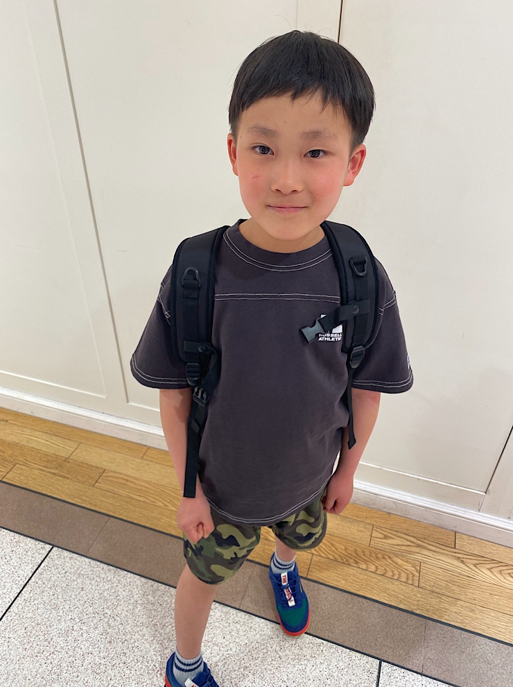 ステッチがかわいいTシャツにナイロンショーツのコーディネート👕 大人気のキッズパッカーズ別注バックパックも再入荷致しました🎒⭐️ 身長128cm