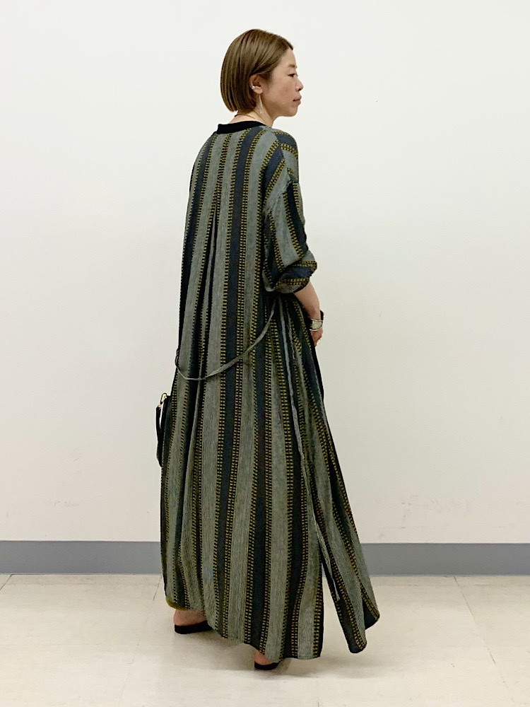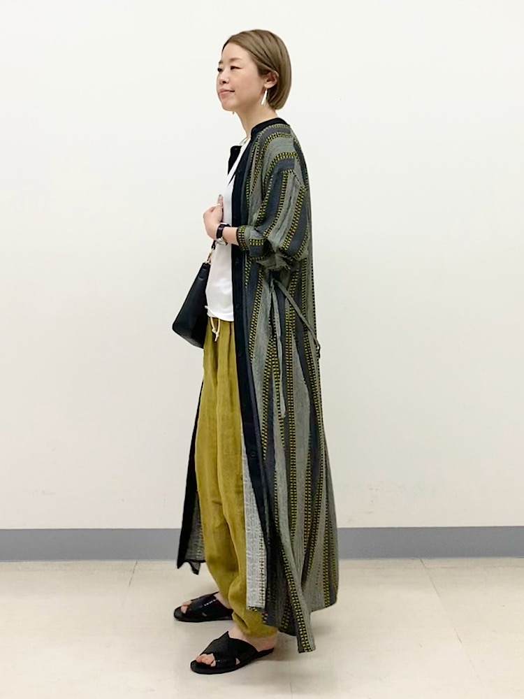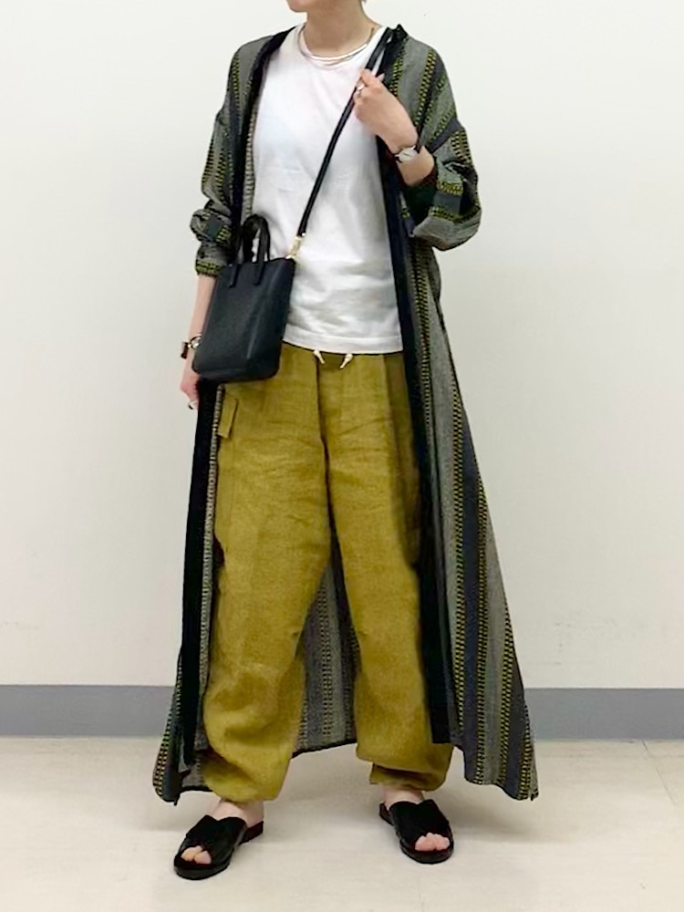 一枚でワンピースとしても着られるアイテムを、羽織りとして使いました。柄の中に、イエローが入っているので、パンツで色を合わせて統一感を出しています。