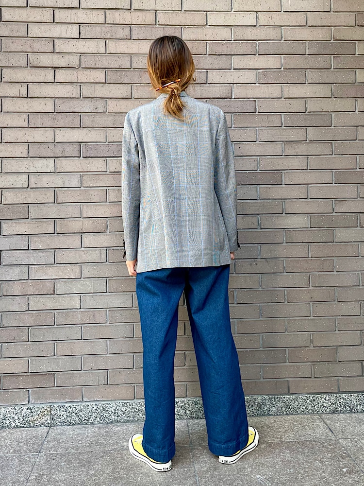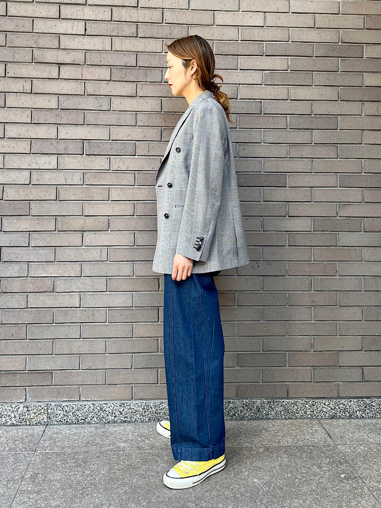 素材感・着心地:柔らかいデニム素材。インナーに合わせ、肩ひもの長さを調整できます。腰からストンと落ちるワイドなシルエットです