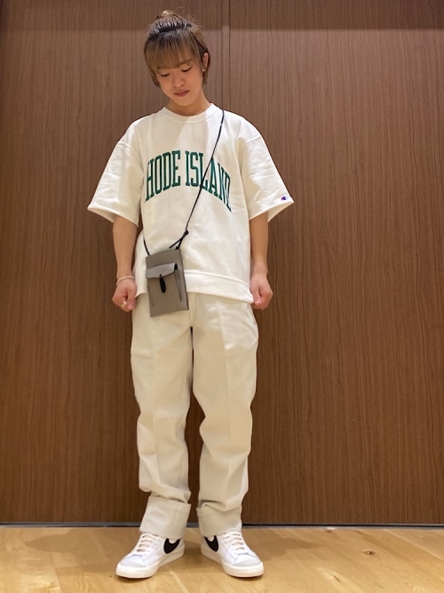 着用感:太すぎず細すぎずでカジュアルにも綺麗めにもどちらにも合わせられる印象です。ディテールのボタンはコッパーカラーとなっており、他の白いパンツとまた違った穿き方でコーディネートを楽しんでいただけると思います。
