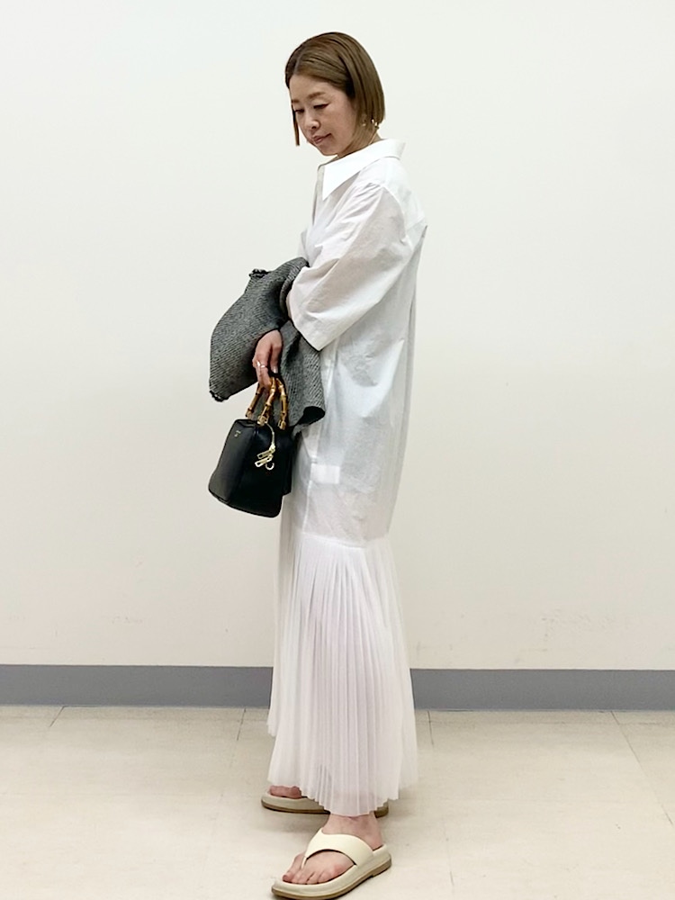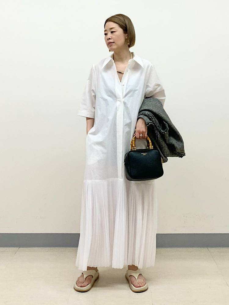 【素材感・着心地】ハリ感とシャリ感が混ざったような独特な風合い。さらっとして軽い素材なので、丈は長めですが、着やすいです。白なので、透け感はあるため、ペチコートやパンツ等の重ね着が安心。