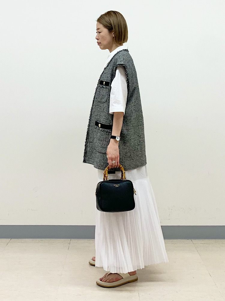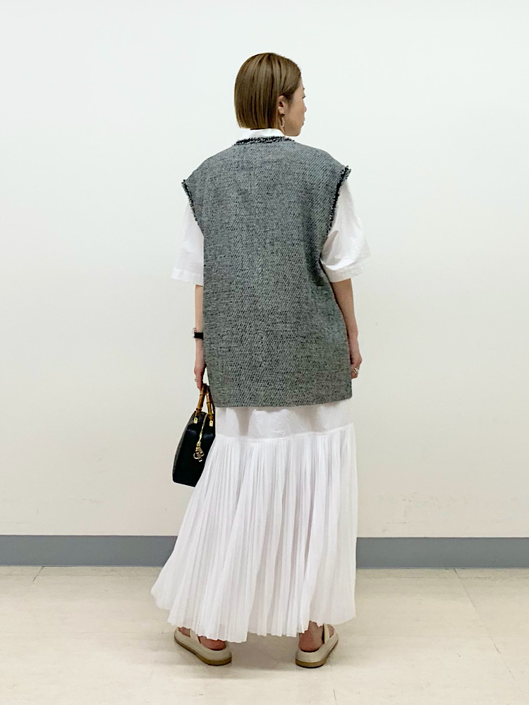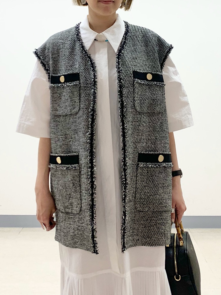 【素材感・着心地】ツイードの固く重いイメージを覆す着やすさ。軽く柔らかい素材なので、迷いなく羽織ることのできるジレです。