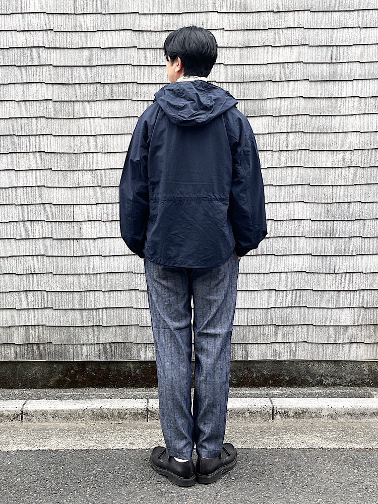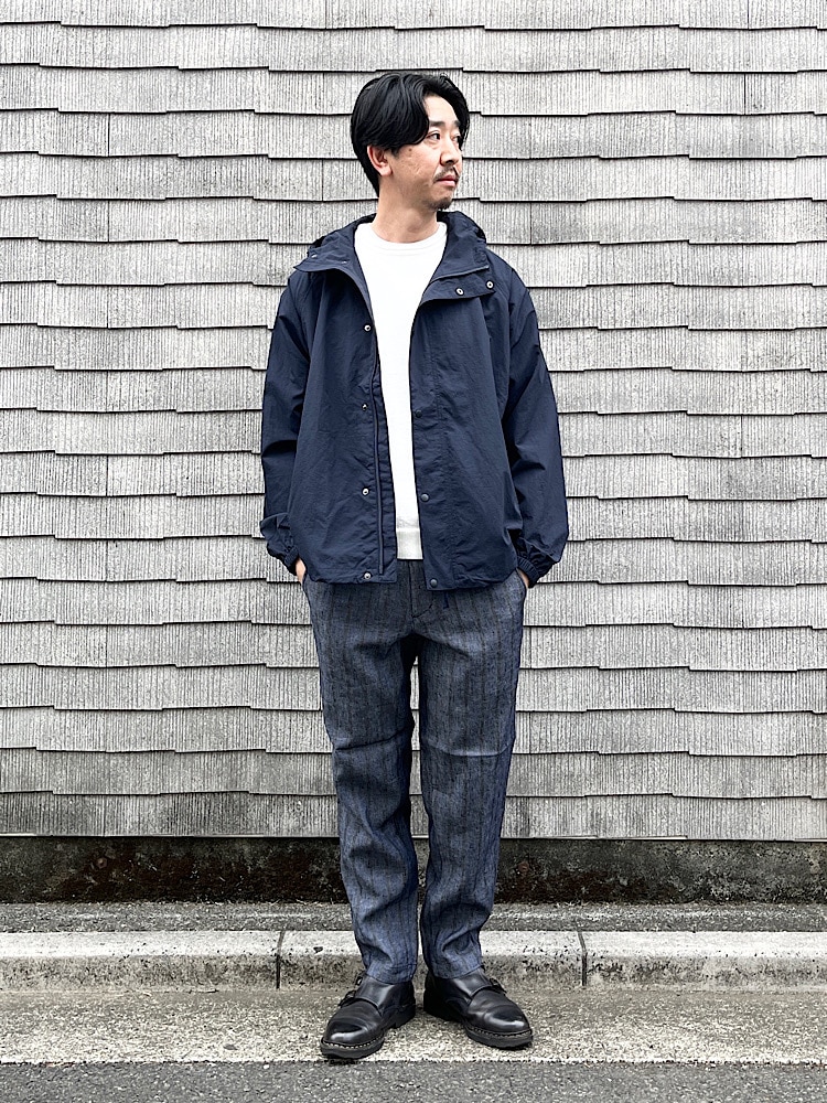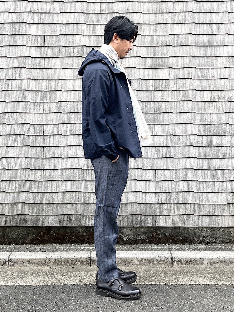 春先に活躍するフードアウターを使用したコーディネートです。細身のリネンのパンツに革靴で上品さをプラスしました。