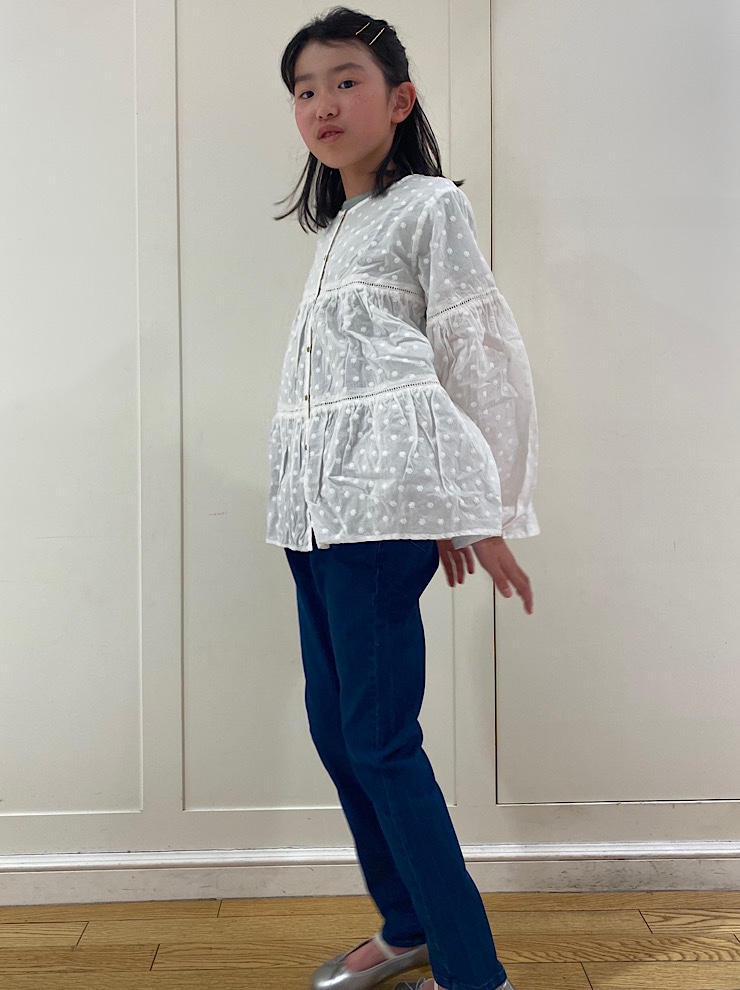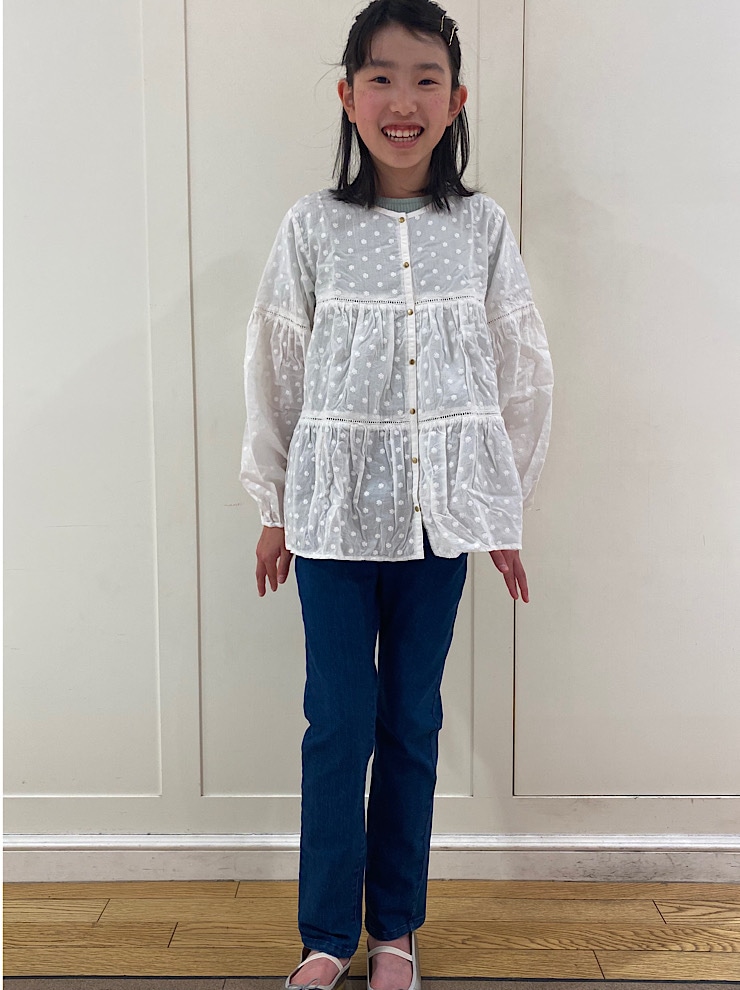 SHIPSKIDSではジュニアサイズのお洋服もご用意しています。ティアードがかわいいブラウスで春コーデ🎀バレエシューズはカジュアルにも履きやすく人気です🩰身長143cm