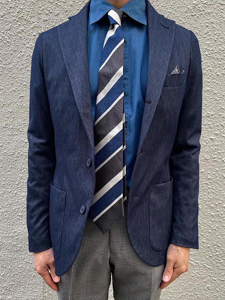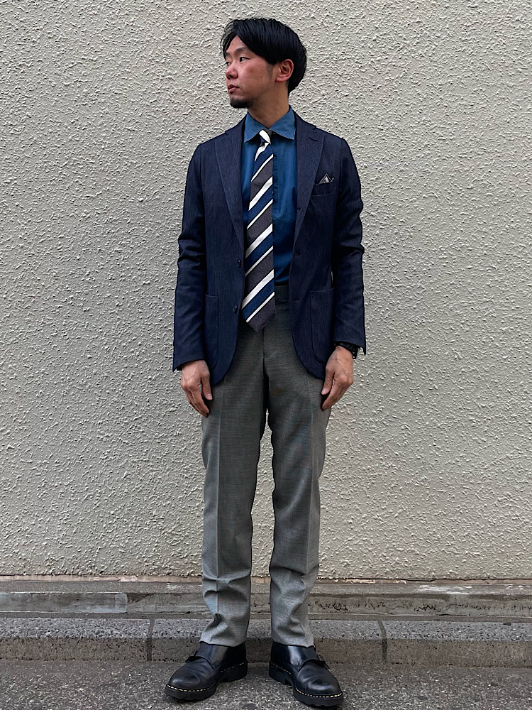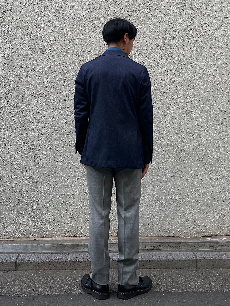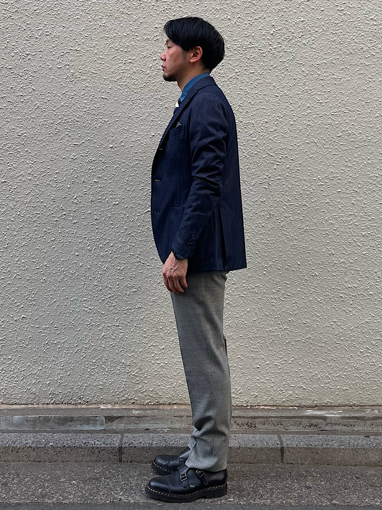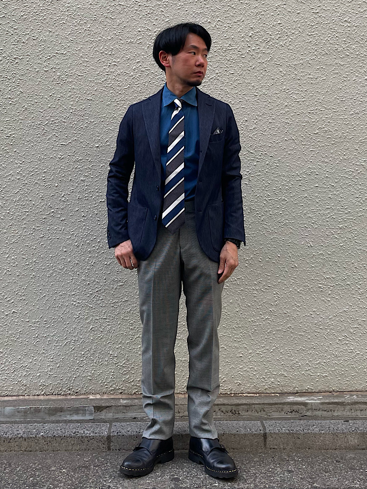 インディゴブルーをキーカラーにしたジャケパンスタイル。