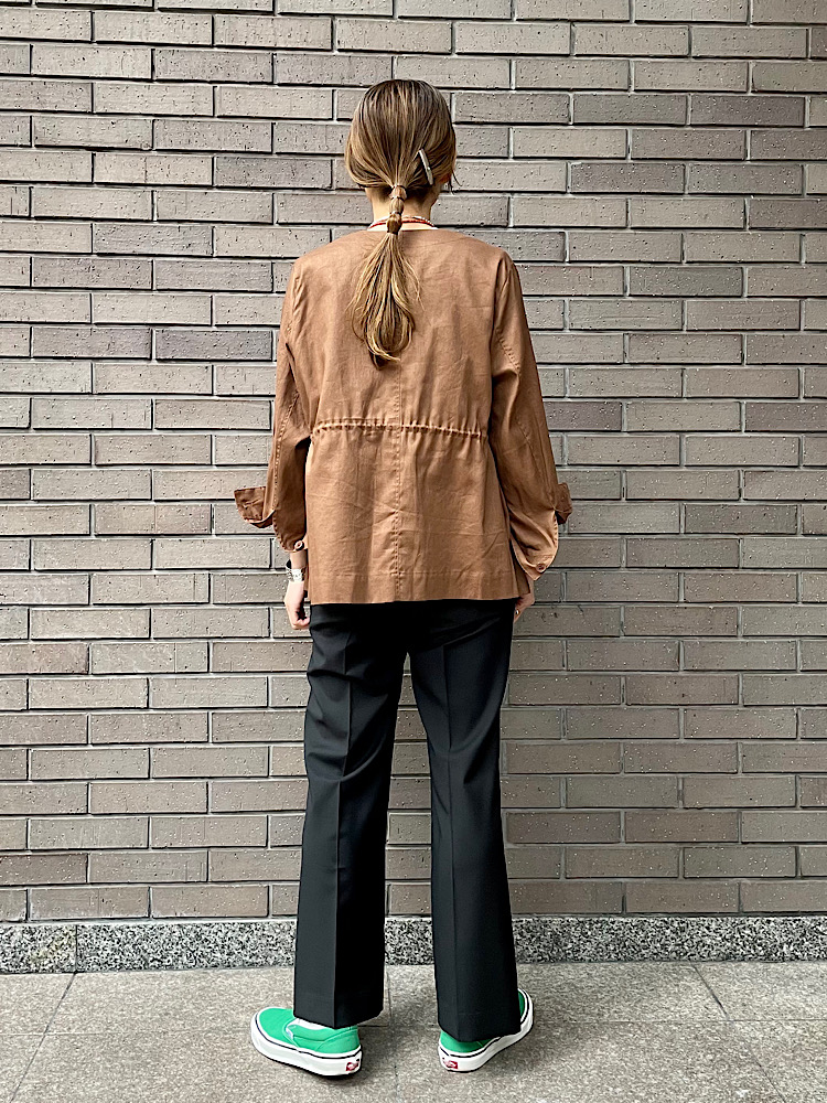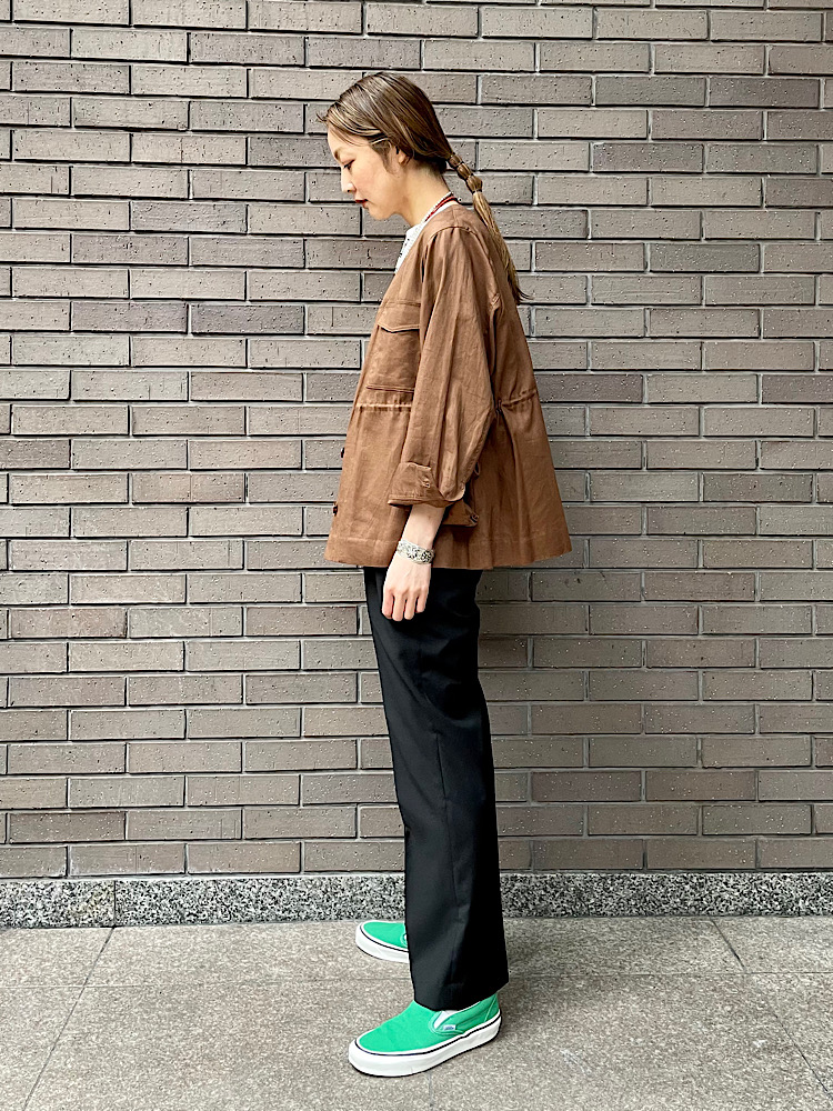 素材感・着心地:コットン/麻の軽い素材感。シャツ感覚で着用できます。ウエストを絞れる様になっておりボトムを選ばず着用できます