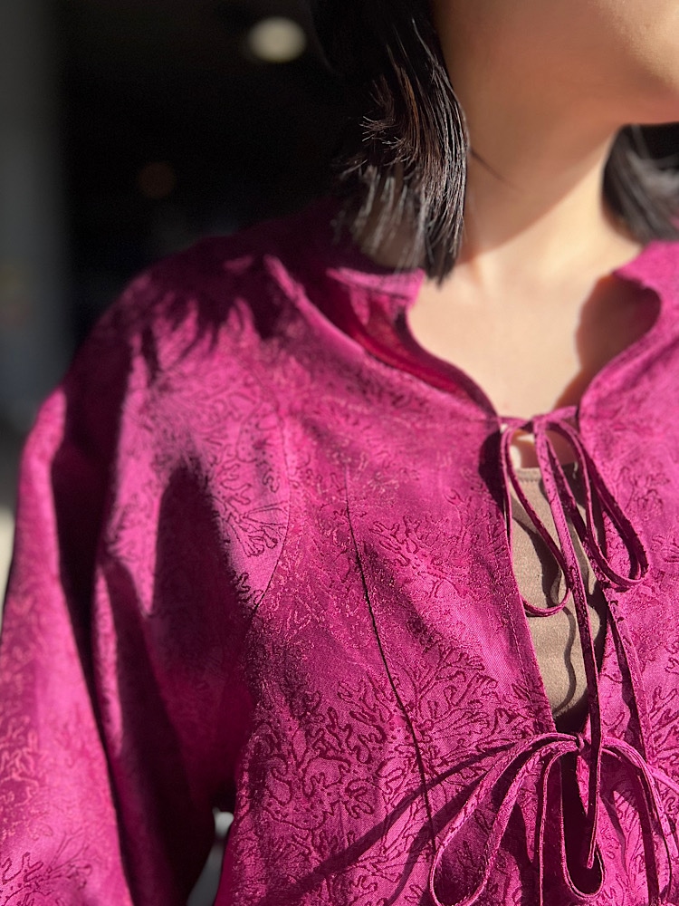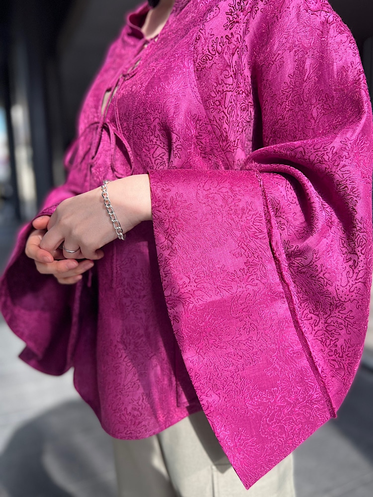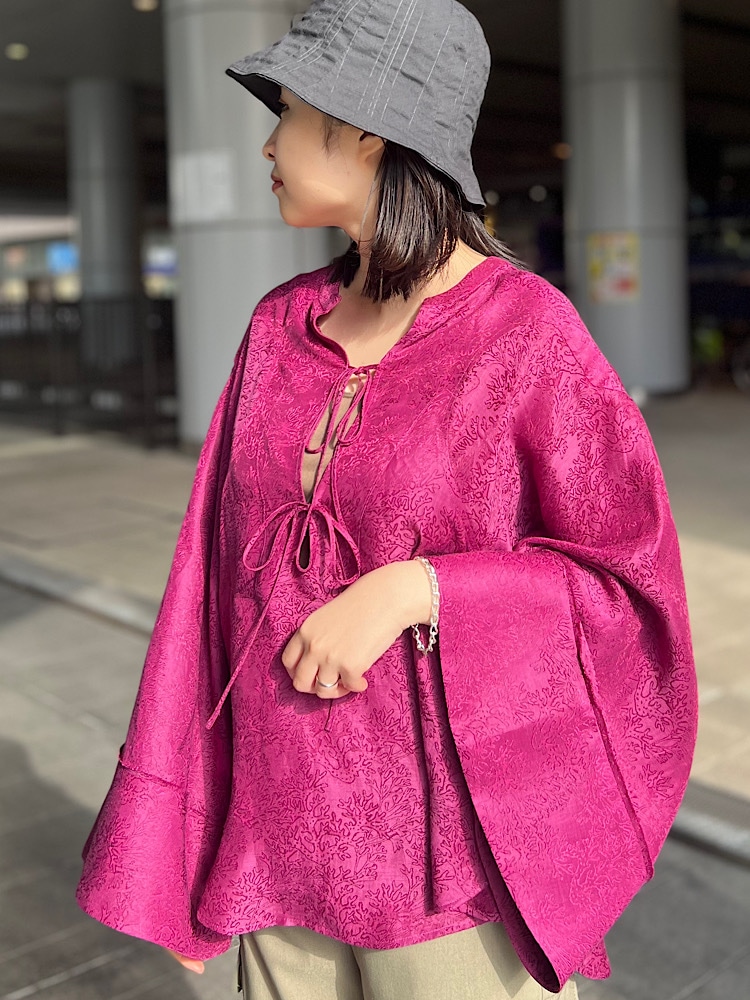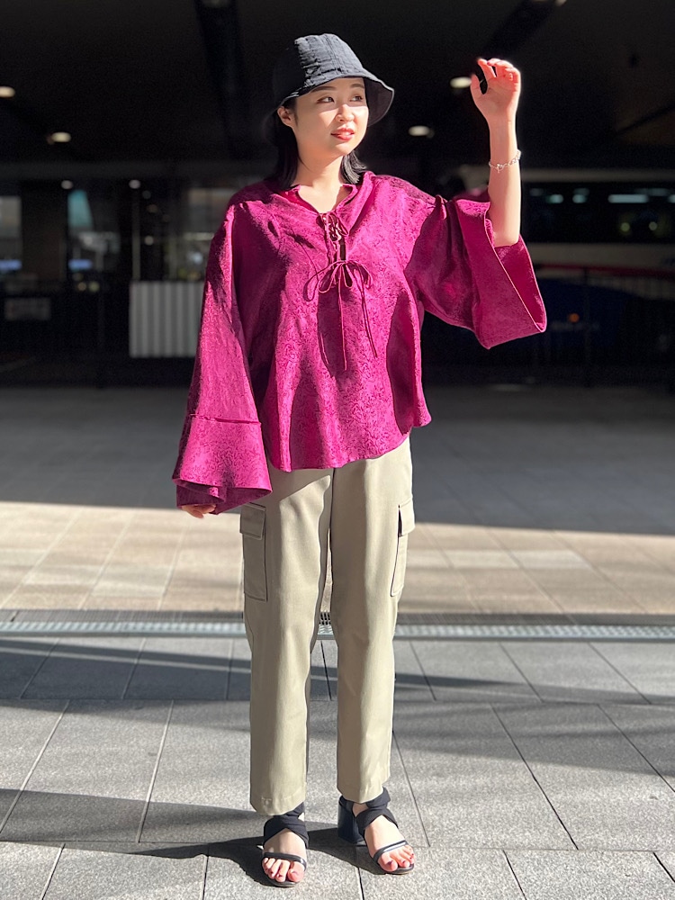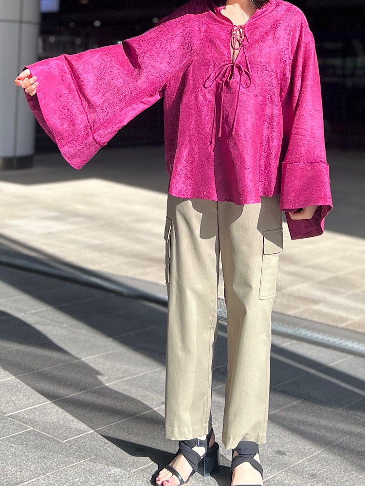 きれいなマゼンタカラーのチャイナ風ブラウスを主役にカジュアルなコーディネートをくんでみました。軽い生地が春のお出かけにぴったりです!