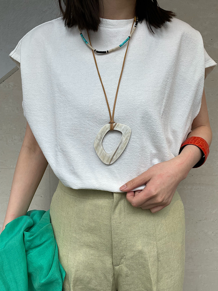 着心地:パイル地のような肌離れの良いコットン素材です。二の腕がすっきり見えるシルエットです◎