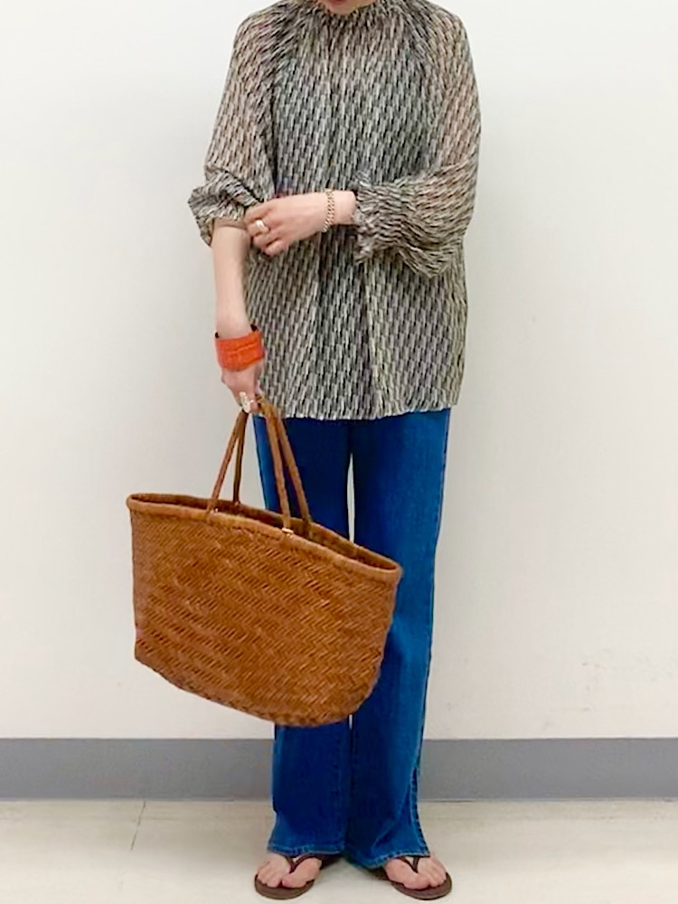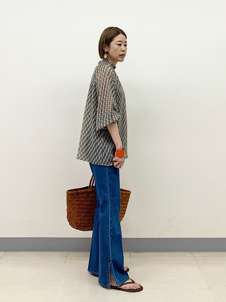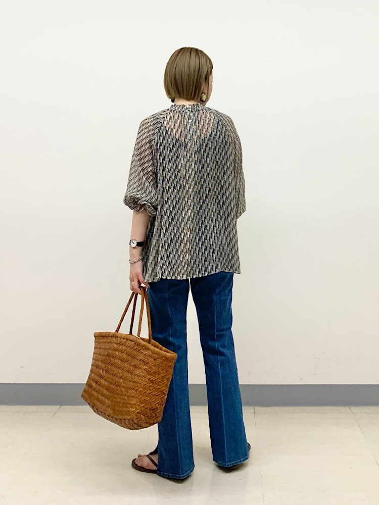 柄が印象的なブラウスは、デニムでシンプルに着るのがおすすめ。少しレトロでクラシックなイメージの柄なので、フレアシルエットで合わせました。