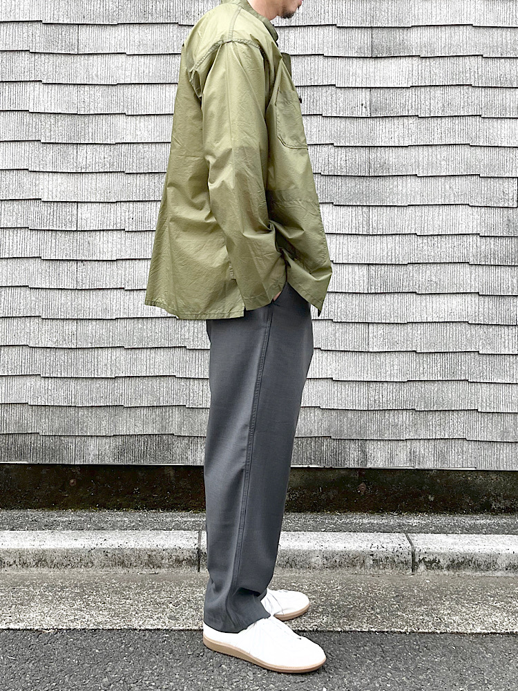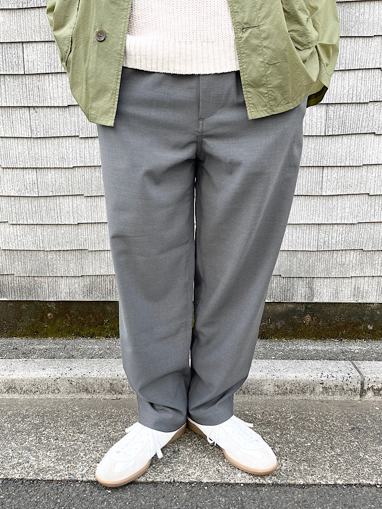 春の別注アイテムが入荷いたしました。ウールライクなパンツにレザースニーカーで上品さを足しました。