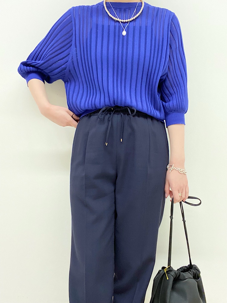 着心地:透け感があるので、清涼感のある軽い着心地です。リブのデザインでシンプルすぎないのもポイントです。袖のふわっと感が女性らしいデザインです。