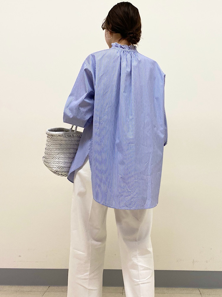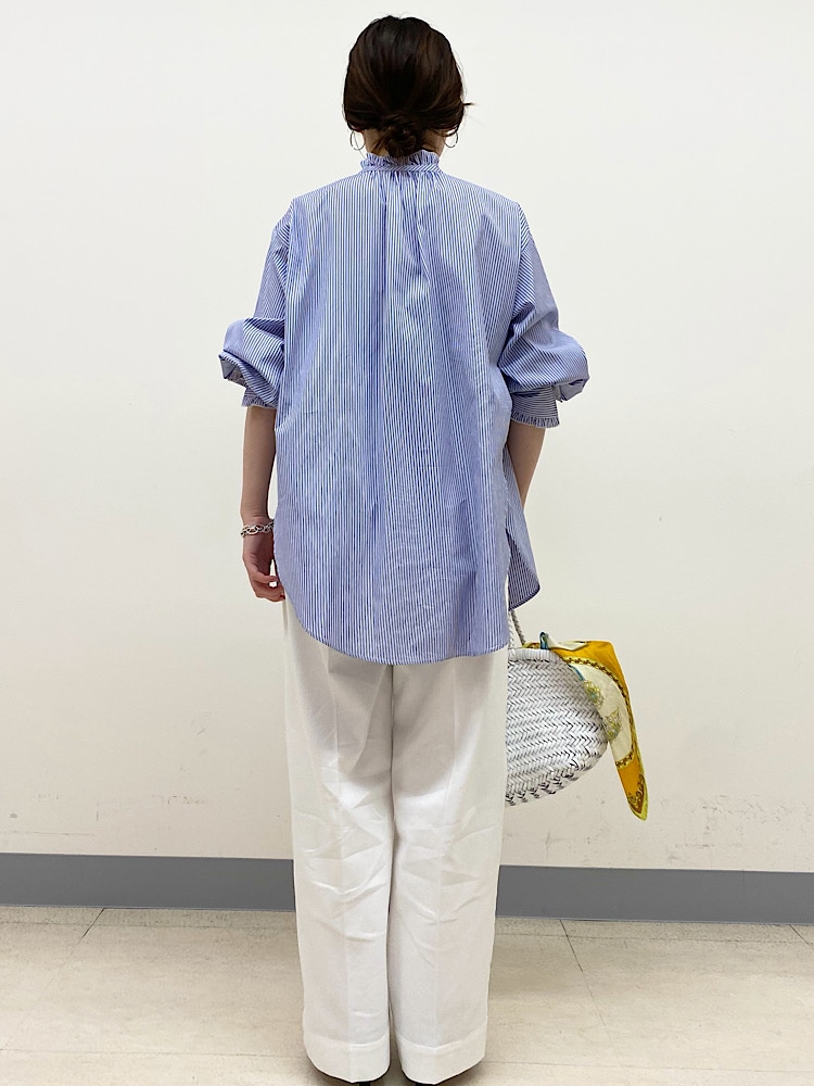 着心地:肌あたりの良いコットン素材です。首元と袖元のフリルが女性らしさを出してくれます。