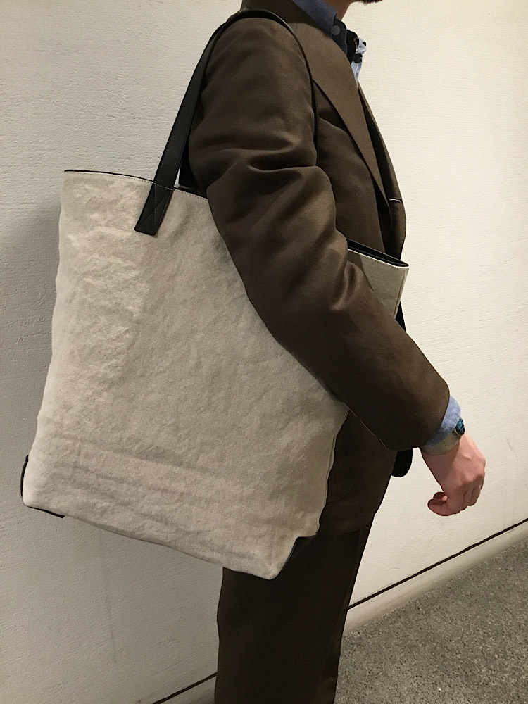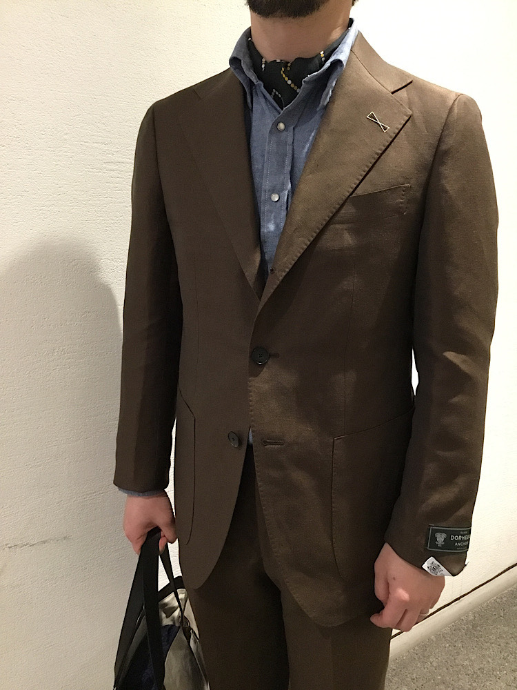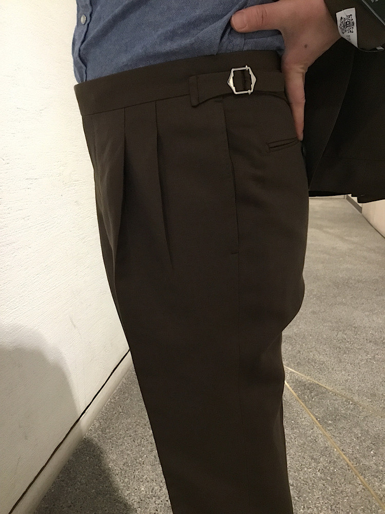 素材感・着心地:麻57%、毛43%の生地で、自然な光沢感があり風合いのあるスーツ。ブラウンカラーが落ち着いた印象を感じる。サイドアジャスター仕様の為、ベルトレスでご着用いただけます。
