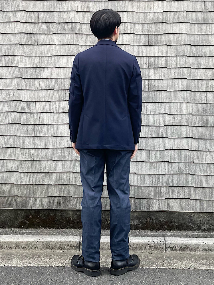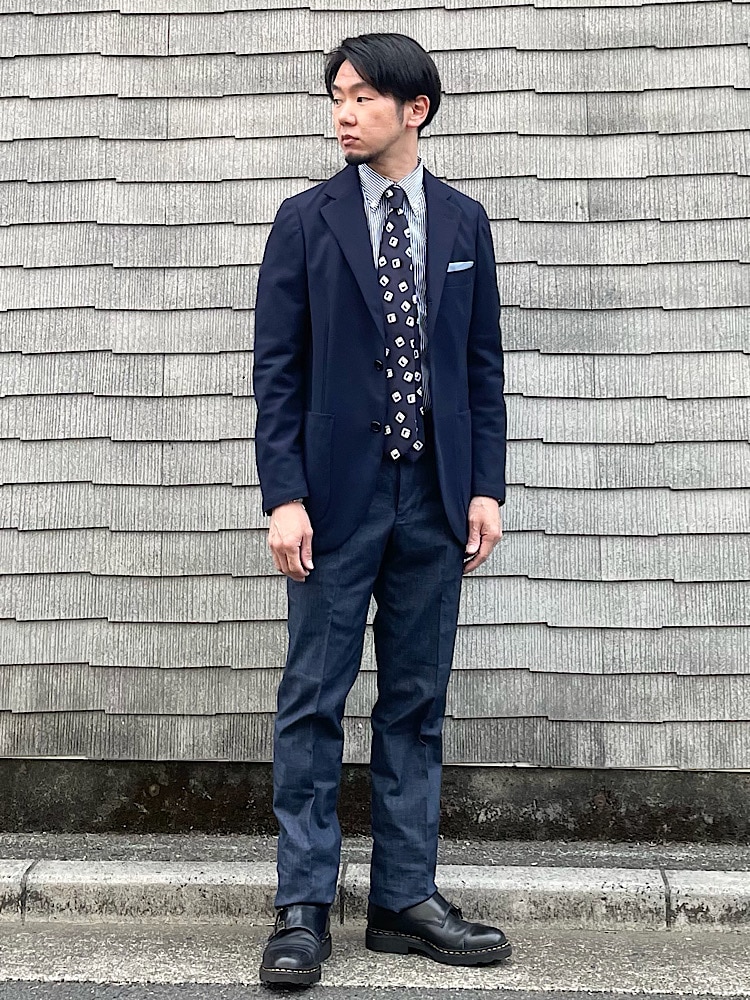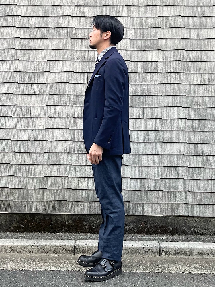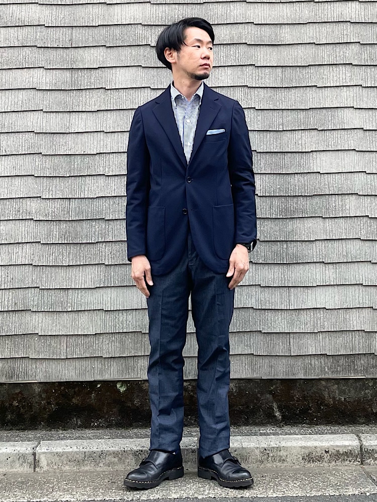 ブルー系のワントーンジャケパンスタイル。オススメのイタリアンBDシャツのコーディネート。