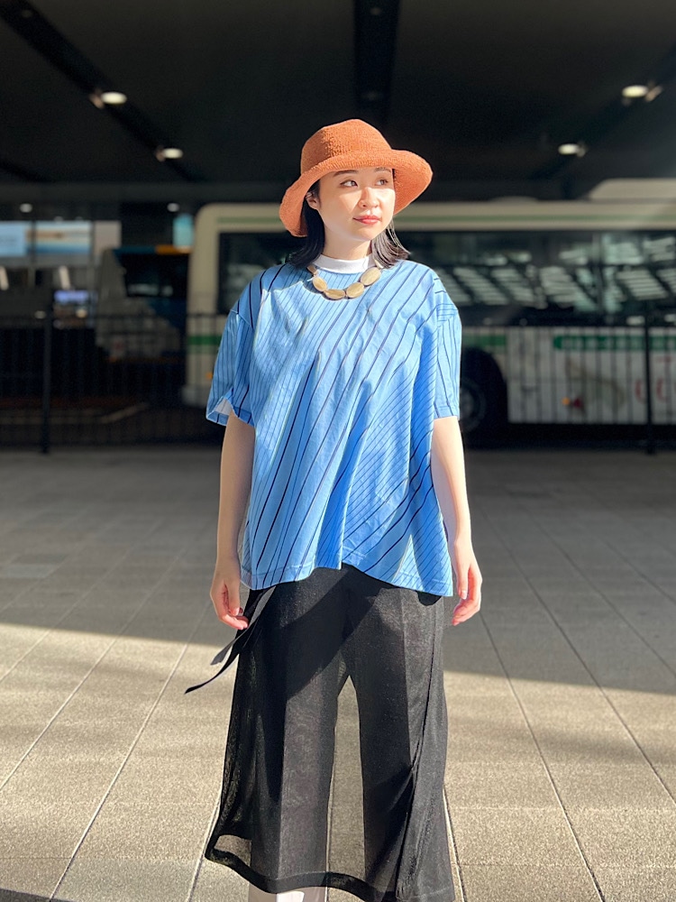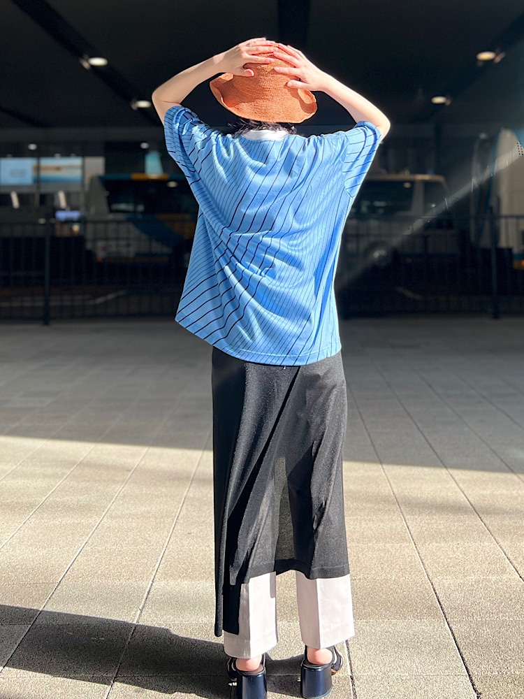 着心地:鮮やか過ぎないさわやかなブルーのカラーリングが主役になるTシャツです。NOMAらしいユニークで存在感のあるデザインがTシャツでもラフになりすぎず、幅広いスタイリングに取り入れて頂けます。気になる二の腕もすっぽりと覆ってカバーしてくれます。首元はプチハイネックですが、白の襟バンドで顔周りの印象を明るく見せてくれます。