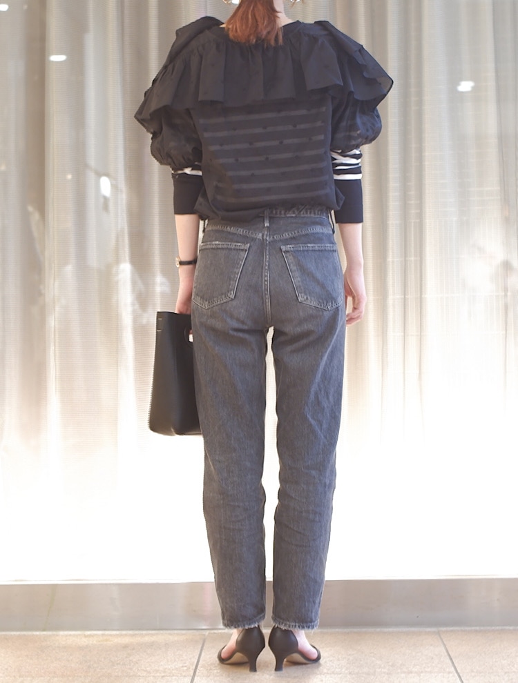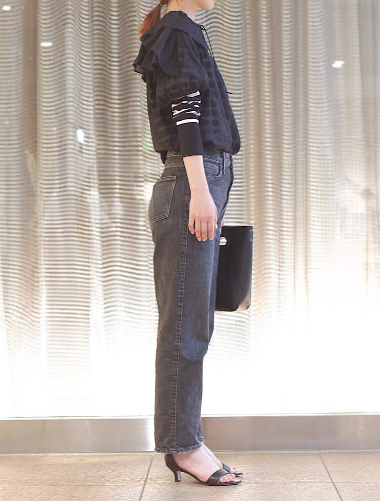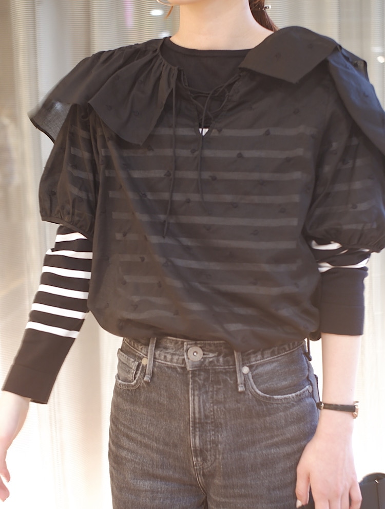 透け感のある素材なので、ボーダーのカットソーをレイヤードしてみました。レイヤードもお楽しみいただけます!