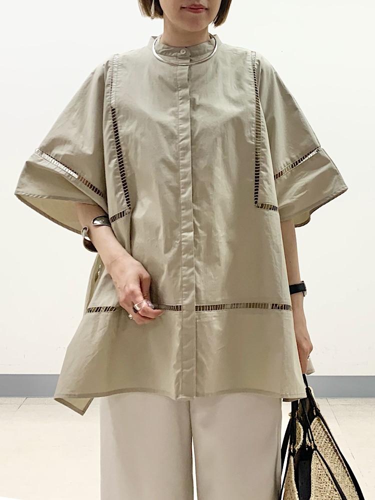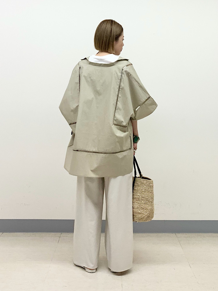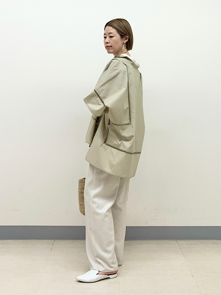 バンドカラーですが、ネックを開けて、少し後ろに抜いて着ると、女性らしさが出ます。ヒップにかけて丸みの出るシルエットに変わり、腰回りもカバーできます。