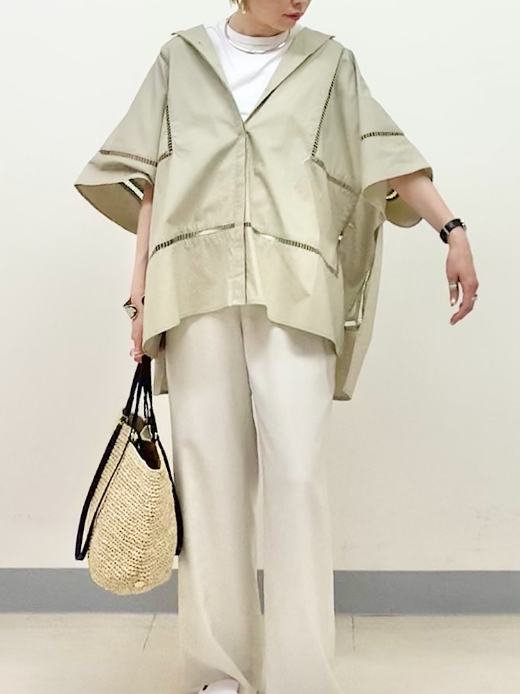 サイズ感:ポンチョ型なので、全体的にゆったりと大きめ。インナーに長袖を着て、寒いときはレイヤードスタイルも楽しめます。