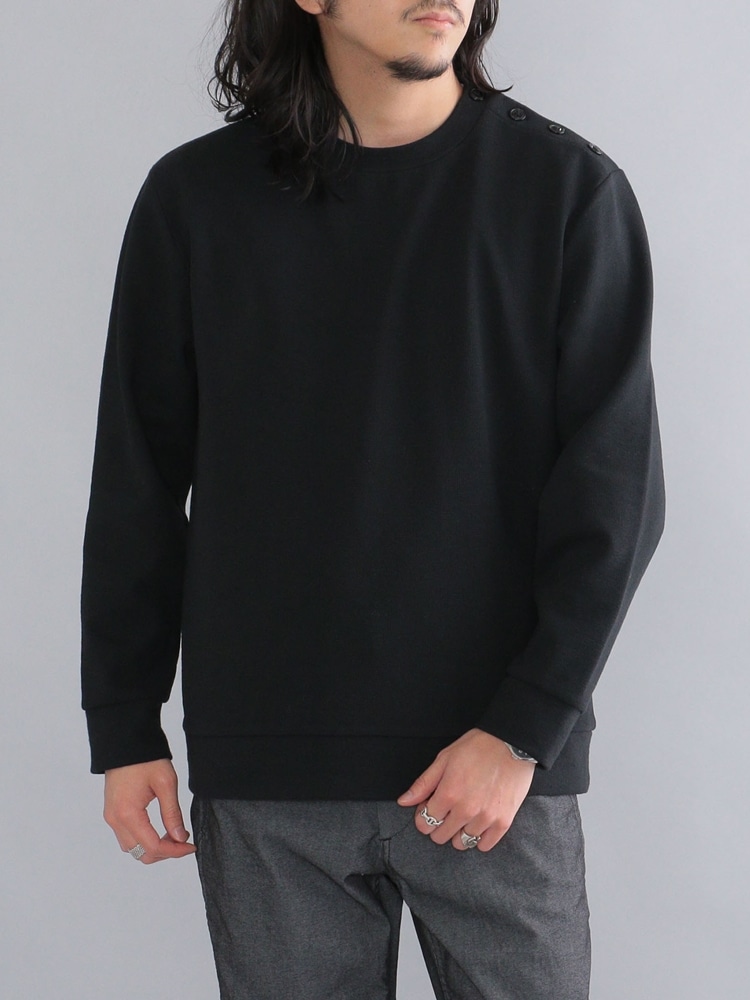 マリンセーターとデニムライクなチノパンを合わせたシックなオールブラックコーデ