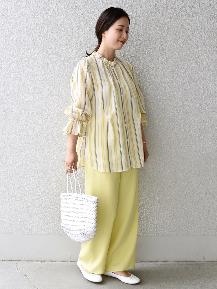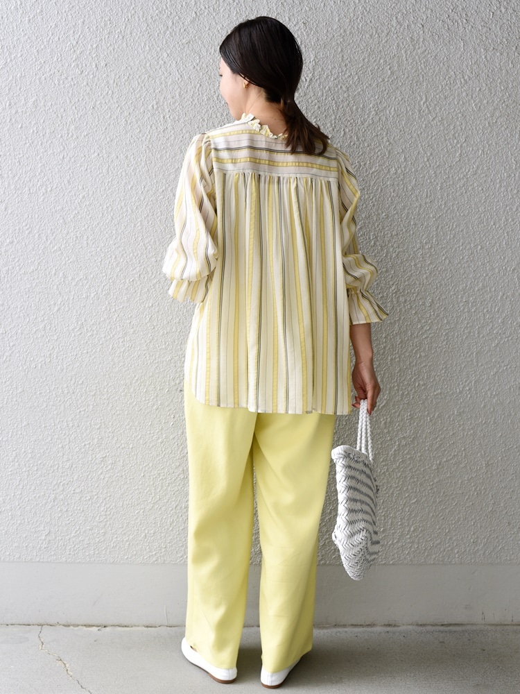 シアーで涼し気なブラウスには同系色のパンツをプラス