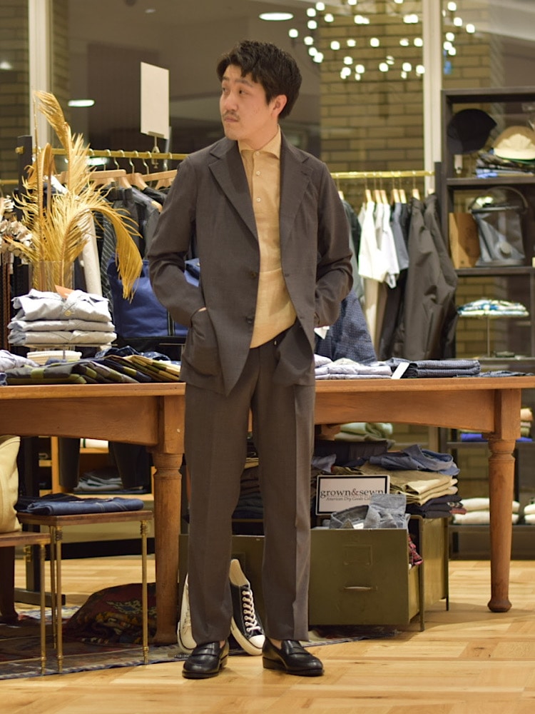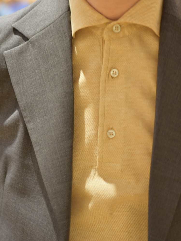 ニューノーマル時代の新定番となったセットアップ+ポロシャツもインナーに明るい色を使用する事で好印象を与えます。
