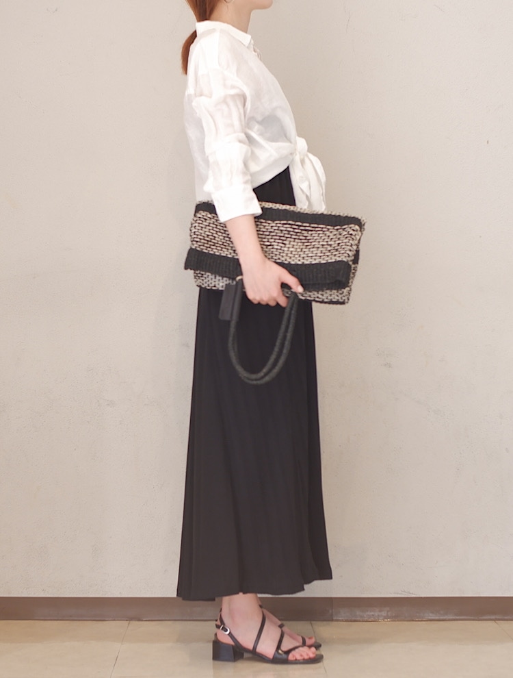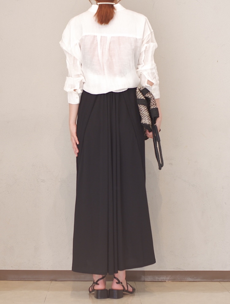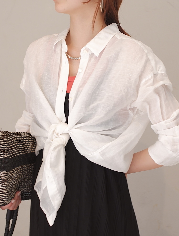 リネン素材で涼しく着て頂けます。サイドにスリットが入っているので、前で結んでワンピースの上から着てみました。