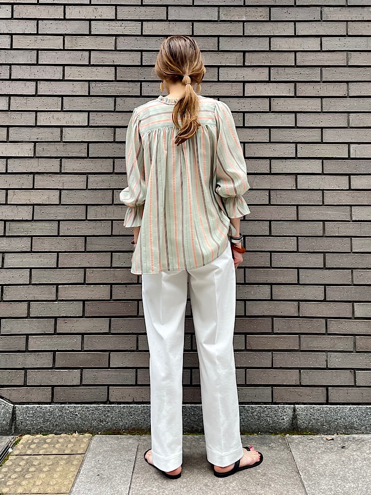 素材感・着心地:少し光沢のあるさらりとした素材。前後で着用可能な2WAY仕様です。袖口がゴムになっており、気温に合わせて丈の調整ができます