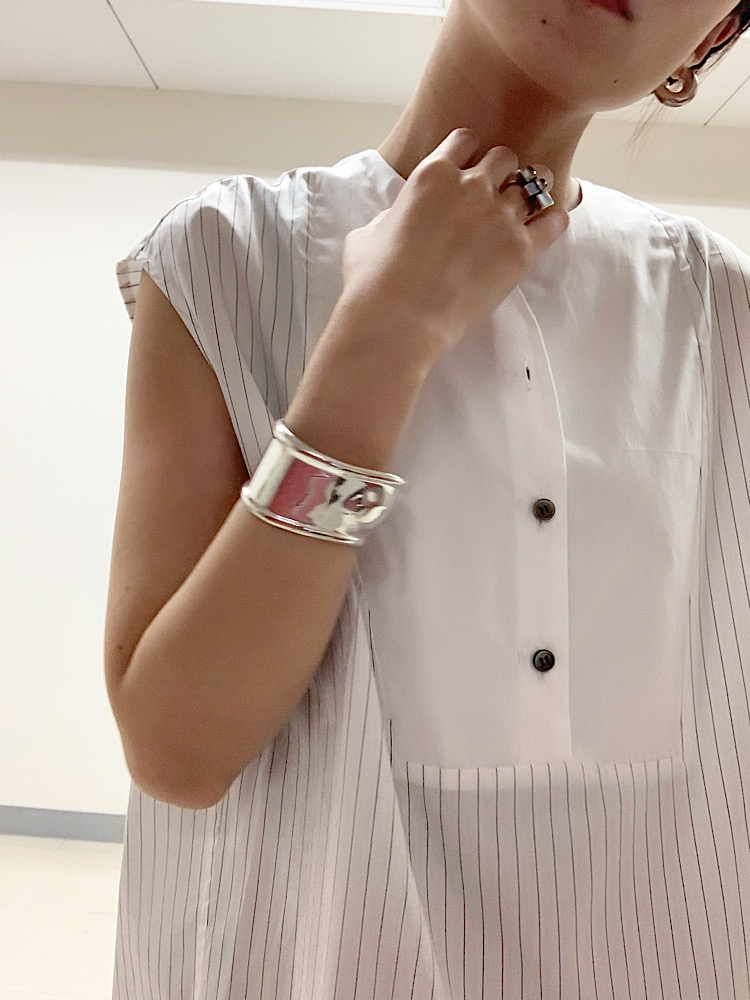 素材感・着心地:柔らかいシャツ素材。ストライプの柄が、かっちり見せてくれます。フレンチスリーブで1枚でも着やすいデザイン。