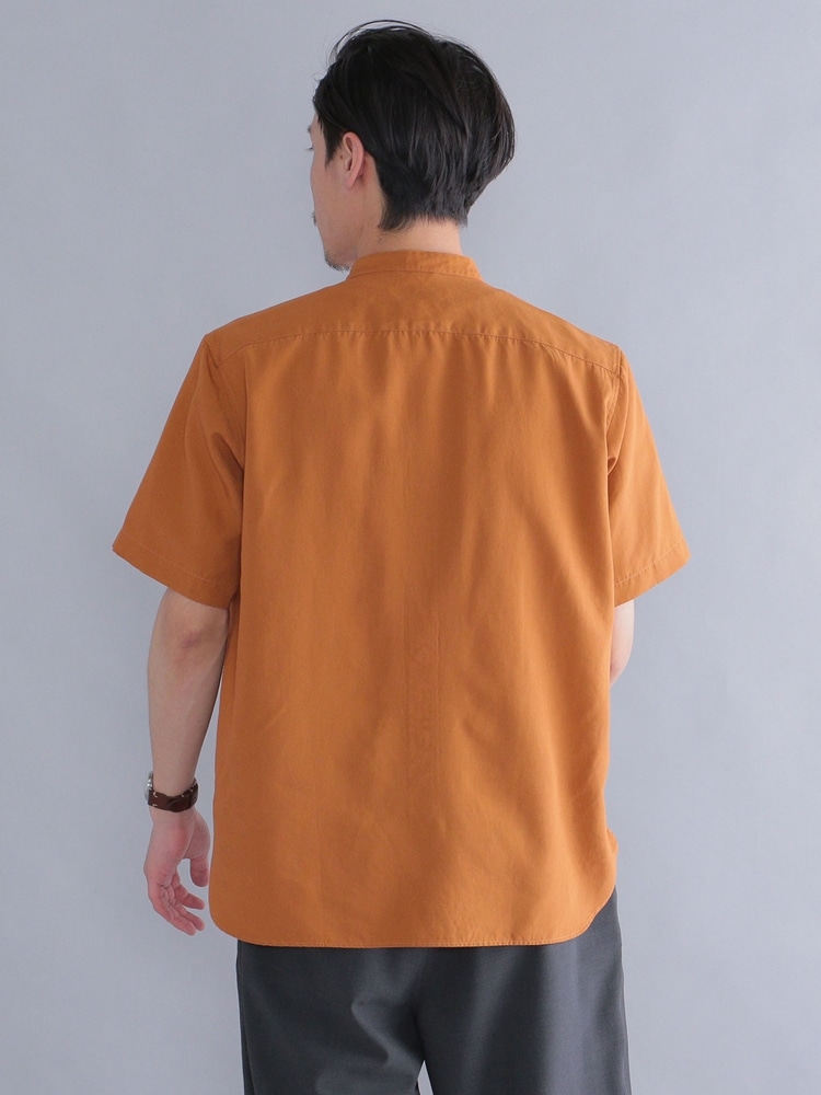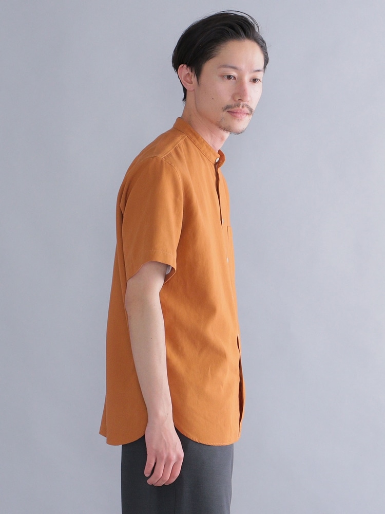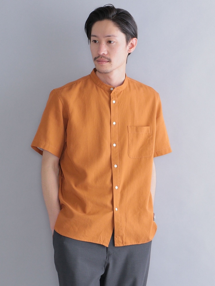 とろみのある素材感のバンドカラーシャツを使用したコーデ。