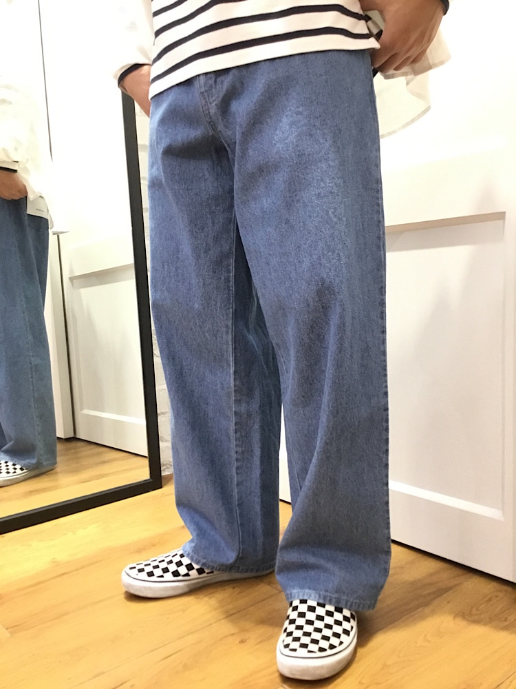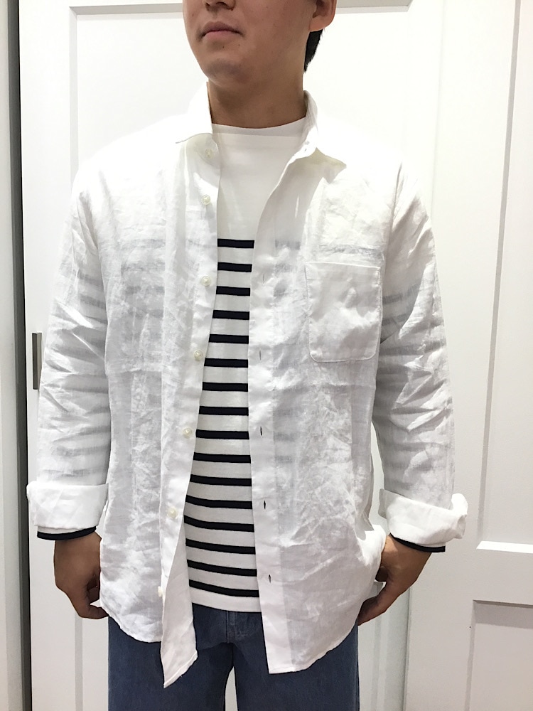 オーガニックリネン素材のレギュラーカラーシャツと、淡いデニムを使ったコーディネートです。爽やかな色味の為、夏にオススメです。