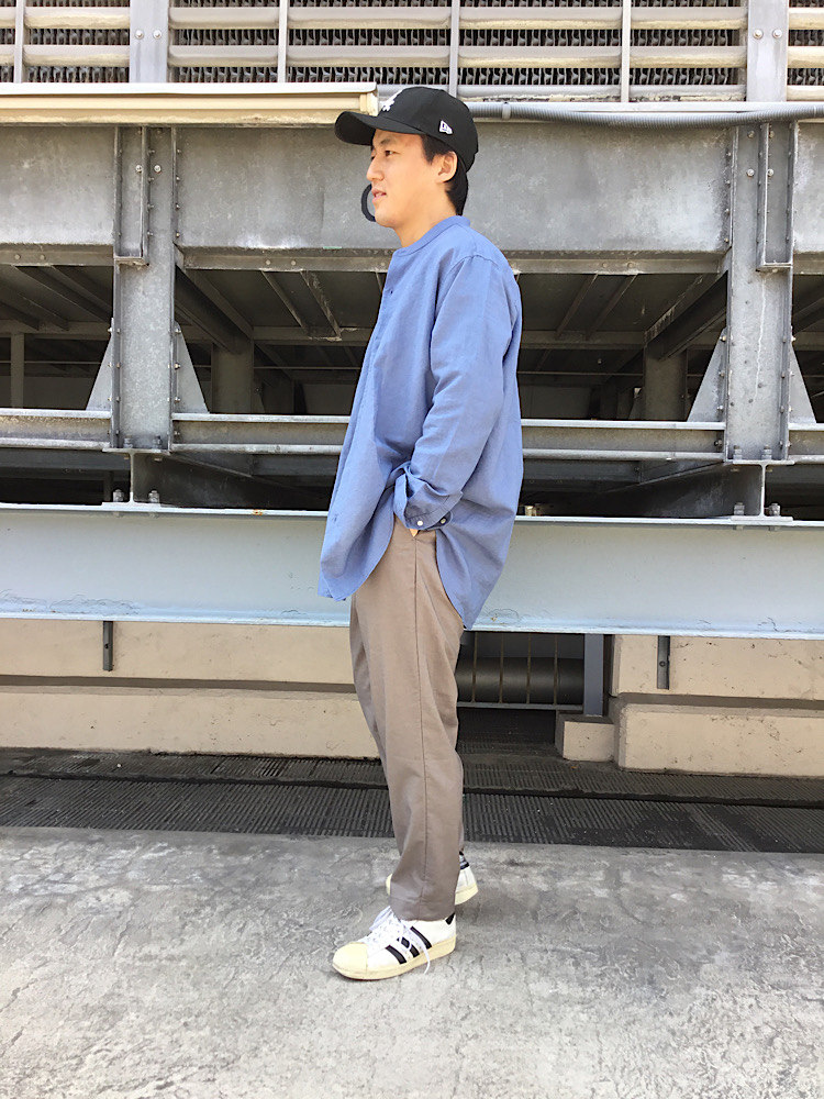 リネンミックス素材のバンドカラーシャツと、ハイブリッドリネン素材のワイドパンツを使ったコーディネートです。上下リネン素材の為、サラッとした着心地です。