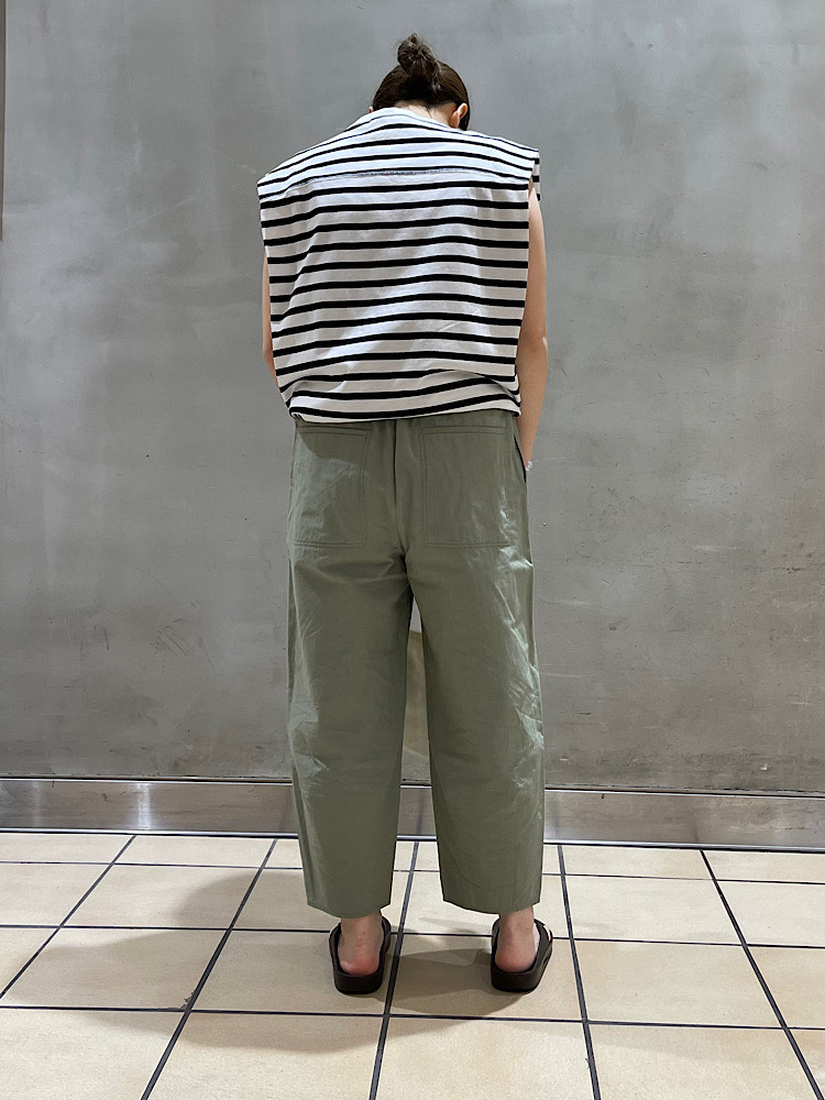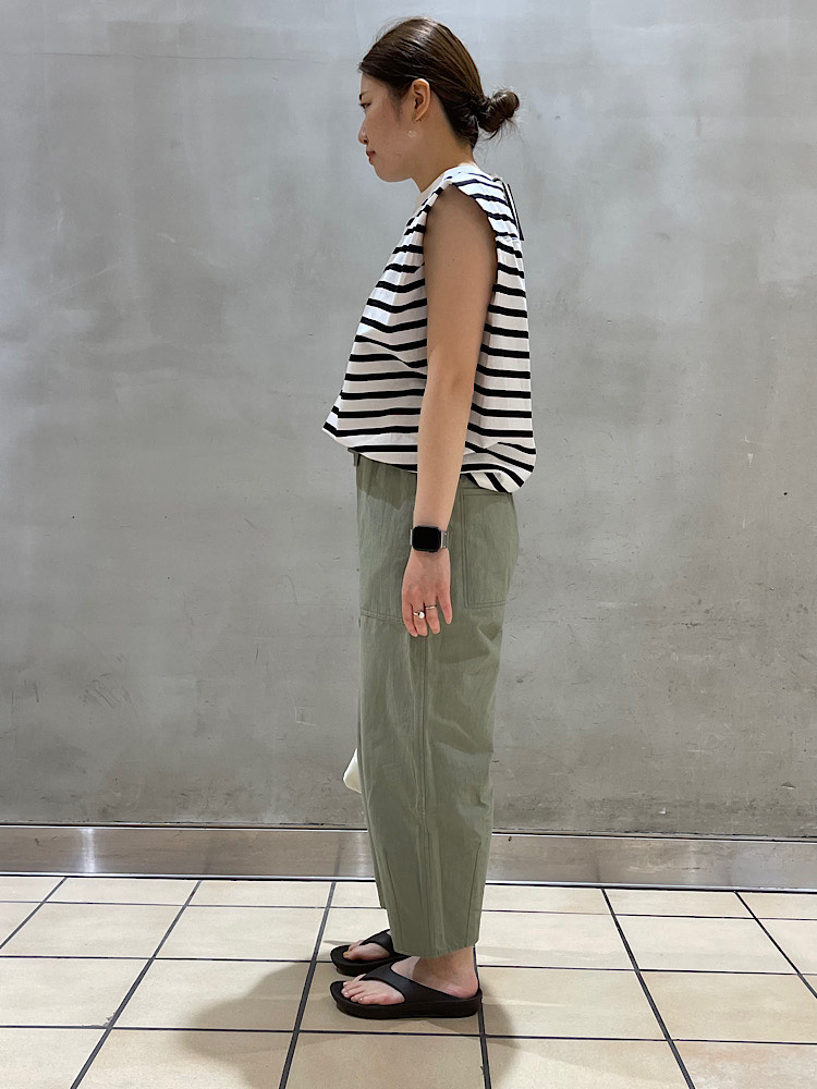 サイズ感:ボトムの幅はゆったりめで、裾がすぼまるシルエットです。