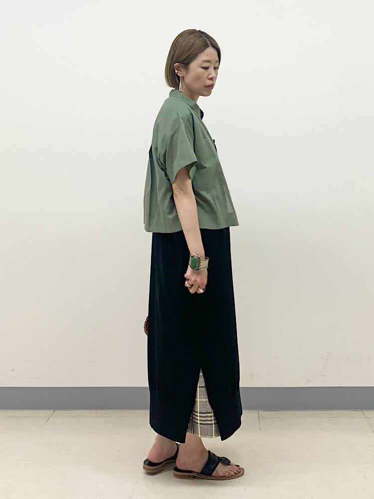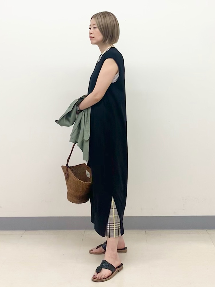 スリットがあるワンピースに、あえてスカートをレイヤード。パンツの合わせが定番ですが、足首を見せ、トングサンダルで女性らしい着こなしに。