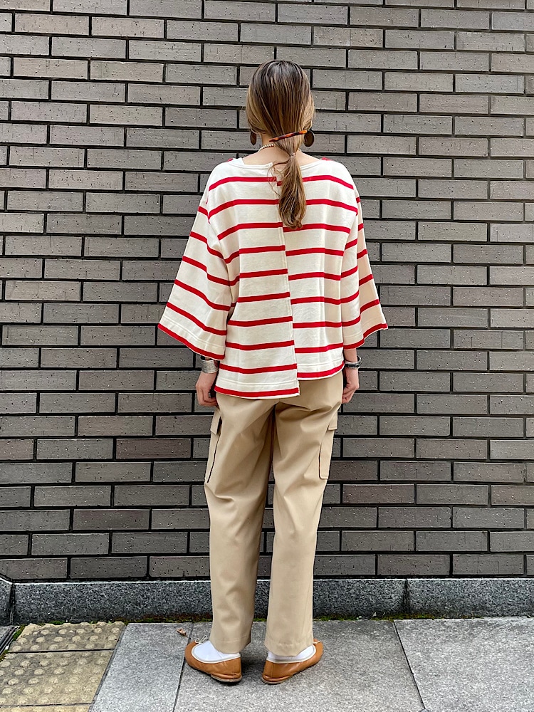 素材感・着心地:コットンの柔らかい素材。身幅、袖幅がゆったりしており、左右非対称のシルエットです。シンプルながらポイントになる一枚です