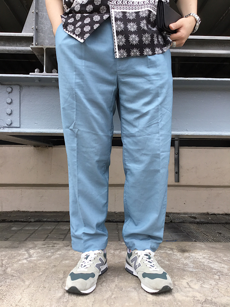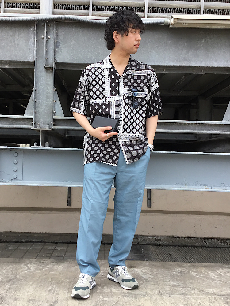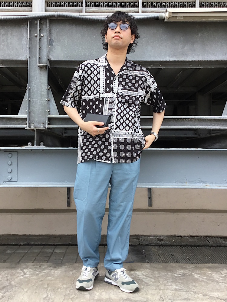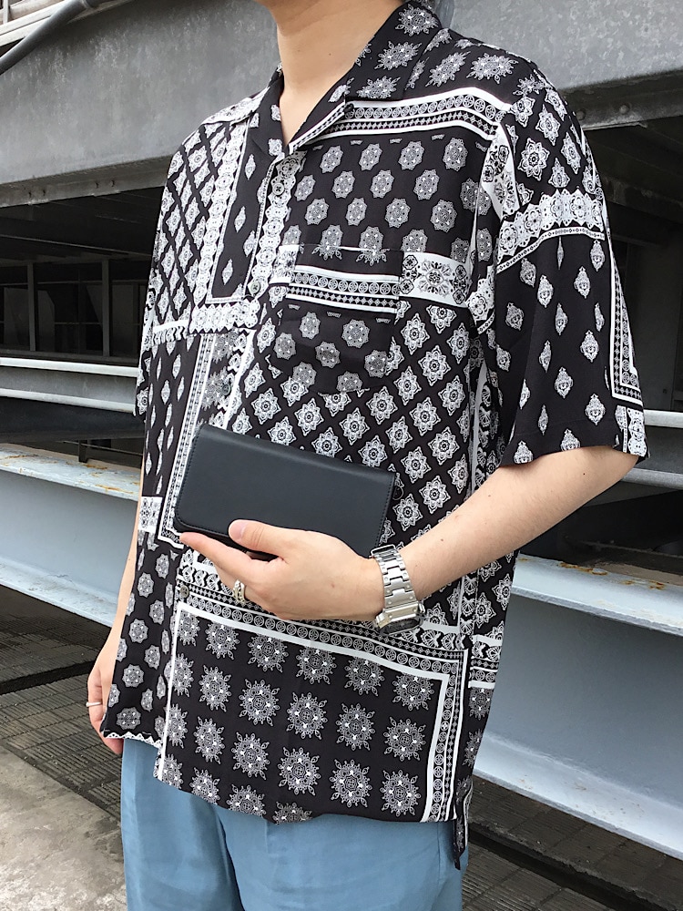 今回はバンダナ柄のオープンカラーシャツにリネンのワイドパンツを合わせたコーディネートです。オープンカラーシャツはセットアップとしても使えるショーツもございますので、ぜひチェックしてみてください!