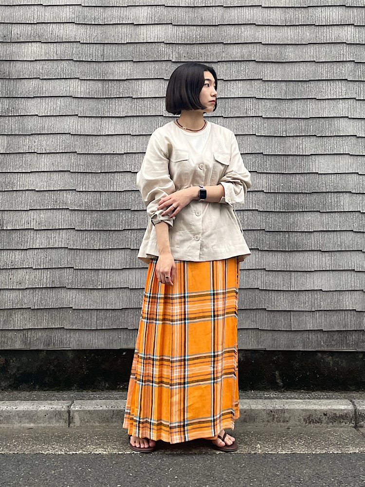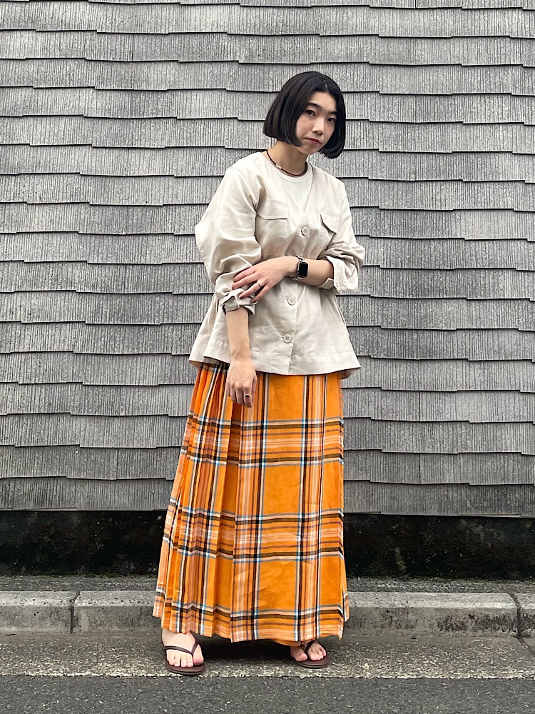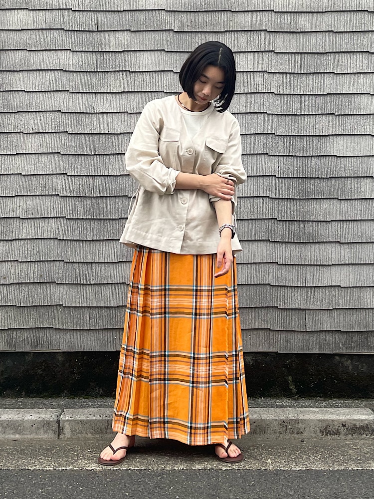 ONEIL OF DUBLIN のキルトスカートにミリタリージャケットを合わせて、リラックスしたスタイリングに仕上げました。