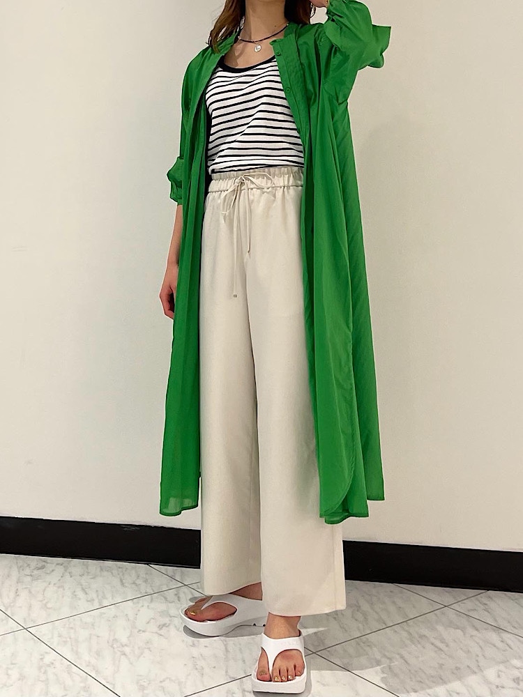 サイズ感:パンツとレイヤードするのにピッタリな丈感。身幅は程よくゆとりがあり、ラインを拾いにくいサイズ感です。
