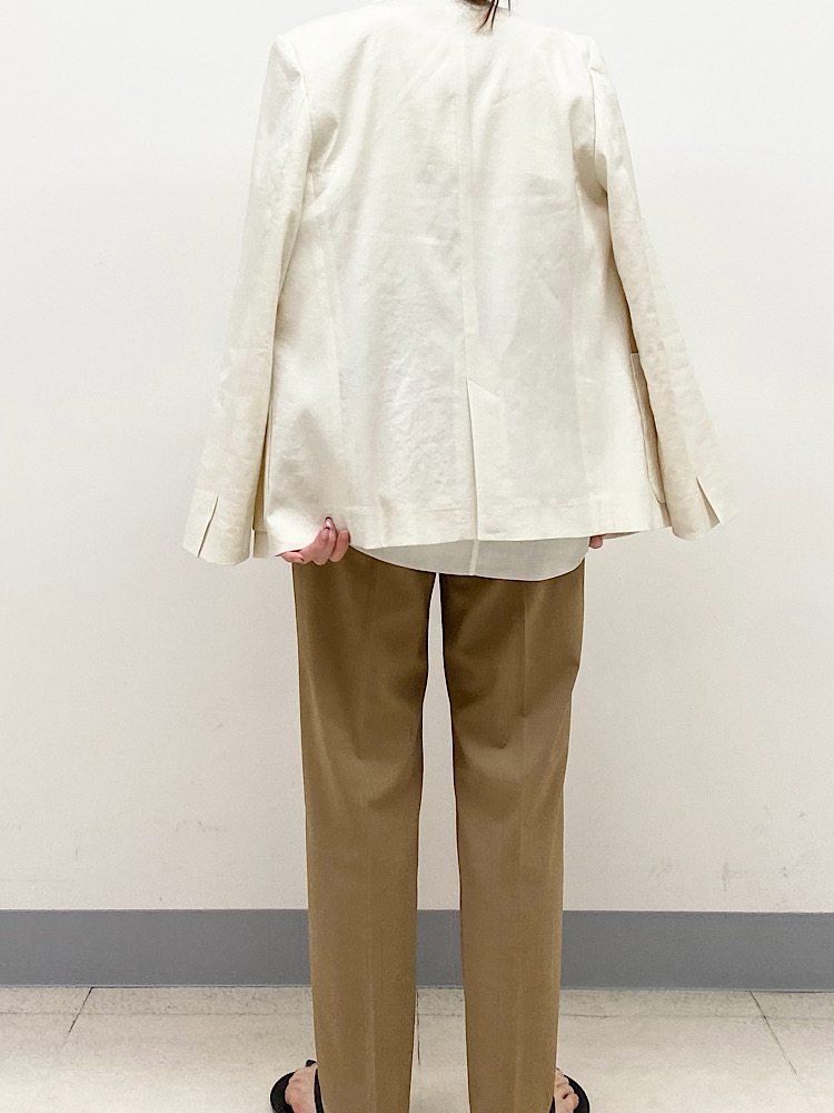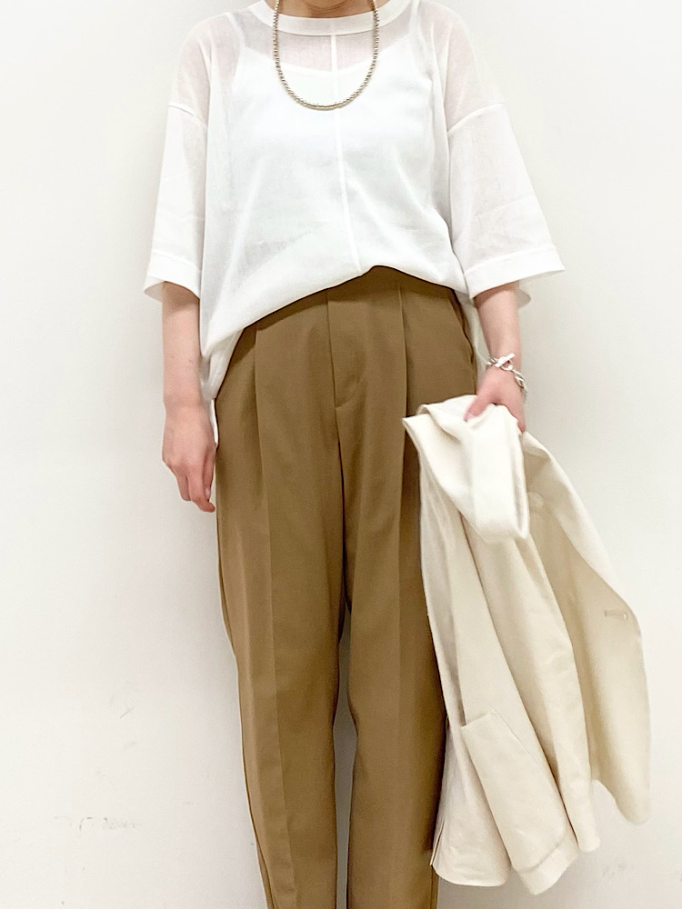 着心地:少しシャリ感のある素材感で、夏場にもとても履きやすい生地感です。テーパードシルエットですっきり見えします。