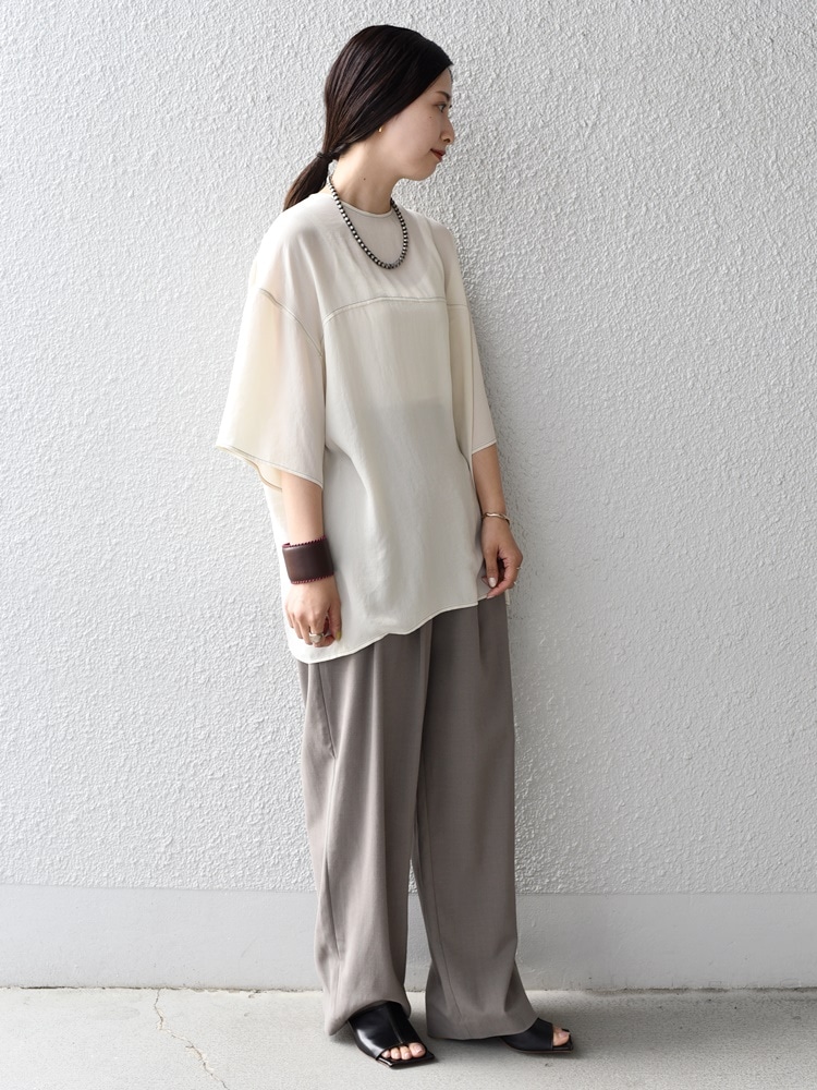 抜け感のあるトップスにはワイドパンツと合わせて上品さをプラス。
