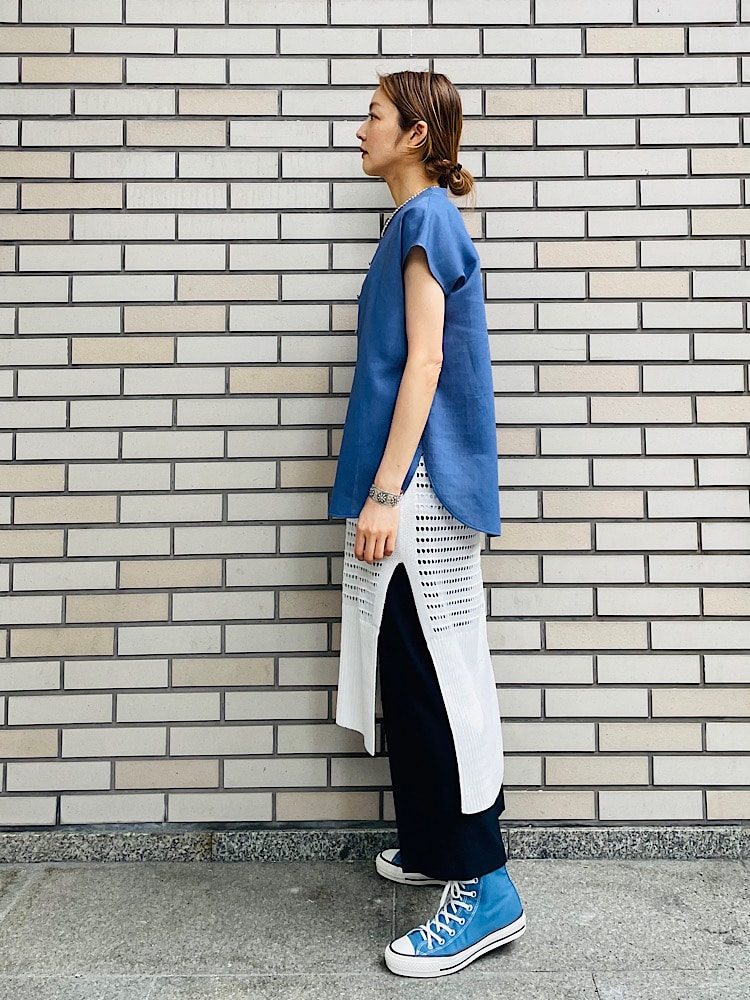 素材感・着心地:コットンの柔らかい素材。メッシュ編みになっており、透け感があります。サイドにスリットも入っている為、レイヤードスタイルにオススメです