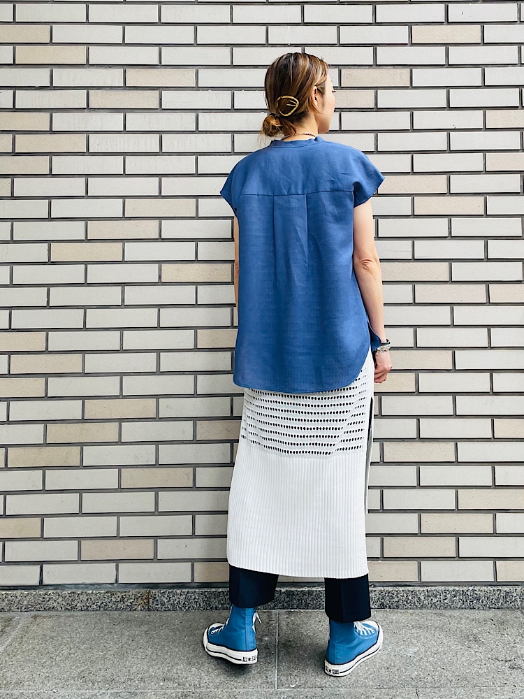 素材感・着心地:ハリのある麻素材。程よく肩が隠れる袖丈なので一枚でも着用しやすいです