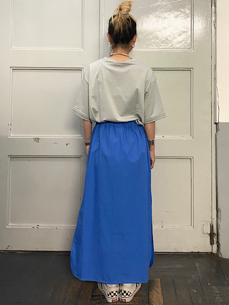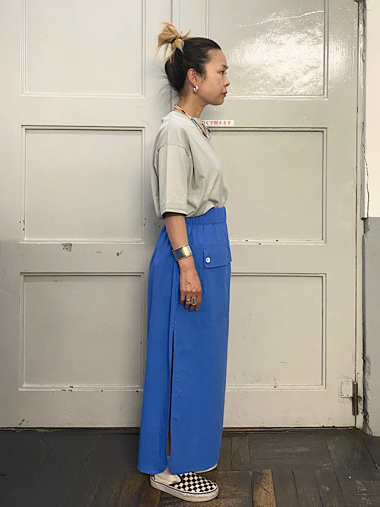 サイズ感:ウエストゴムですが少し大きめです。着丈もロングになり、サイドスリットがポイント。