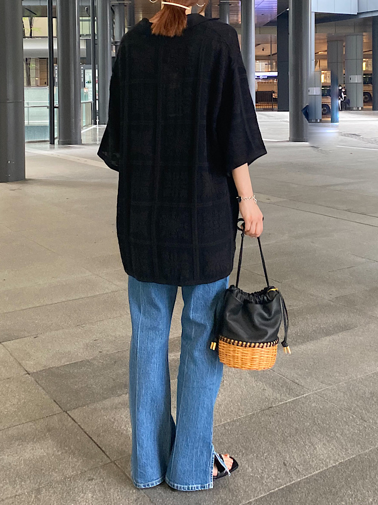 着心地:デニムでも柔らかく最初から履いて頂きやすいです。サイドのスリットで抜け感があります。