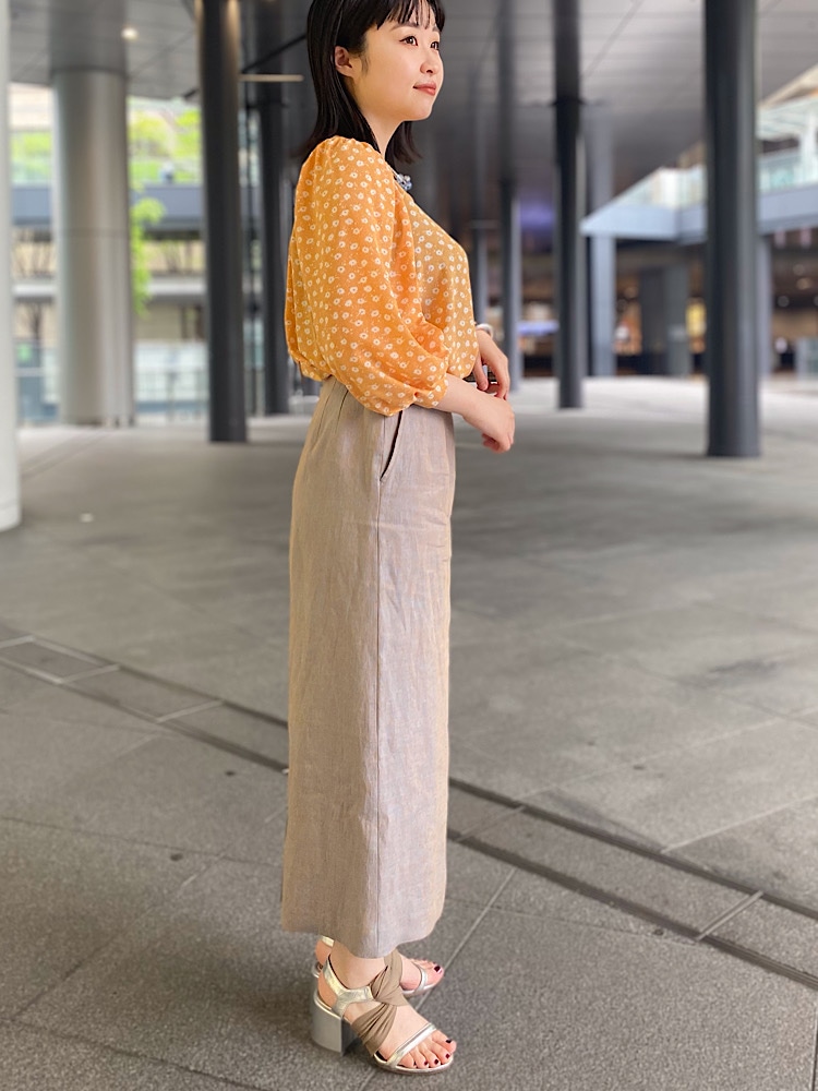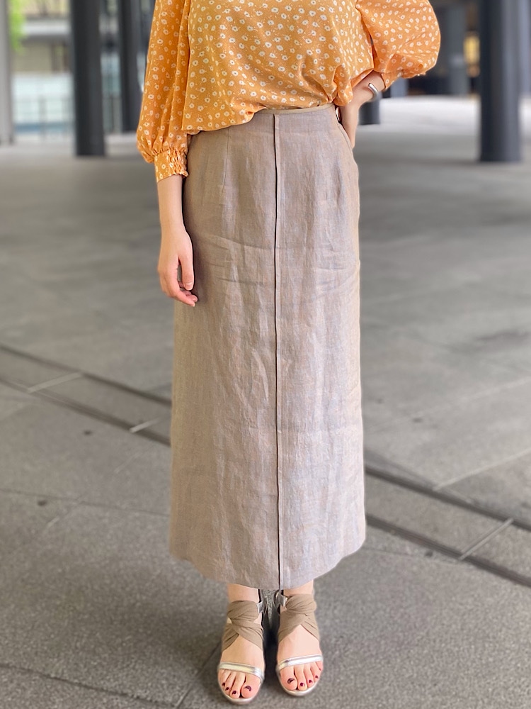 着心地:ウエストぴったりなサイズ感です。ハイウエストシルエットで脚長効果抜群です!まっすぐ落ちてくれる形がブラウスなどのきれいめなスタイルにおすすめです。ぱっと見は単色に見えますが、近くで見ると複数のカラーの糸を含んだメランジ生地になっていて、のっぺり見えません。