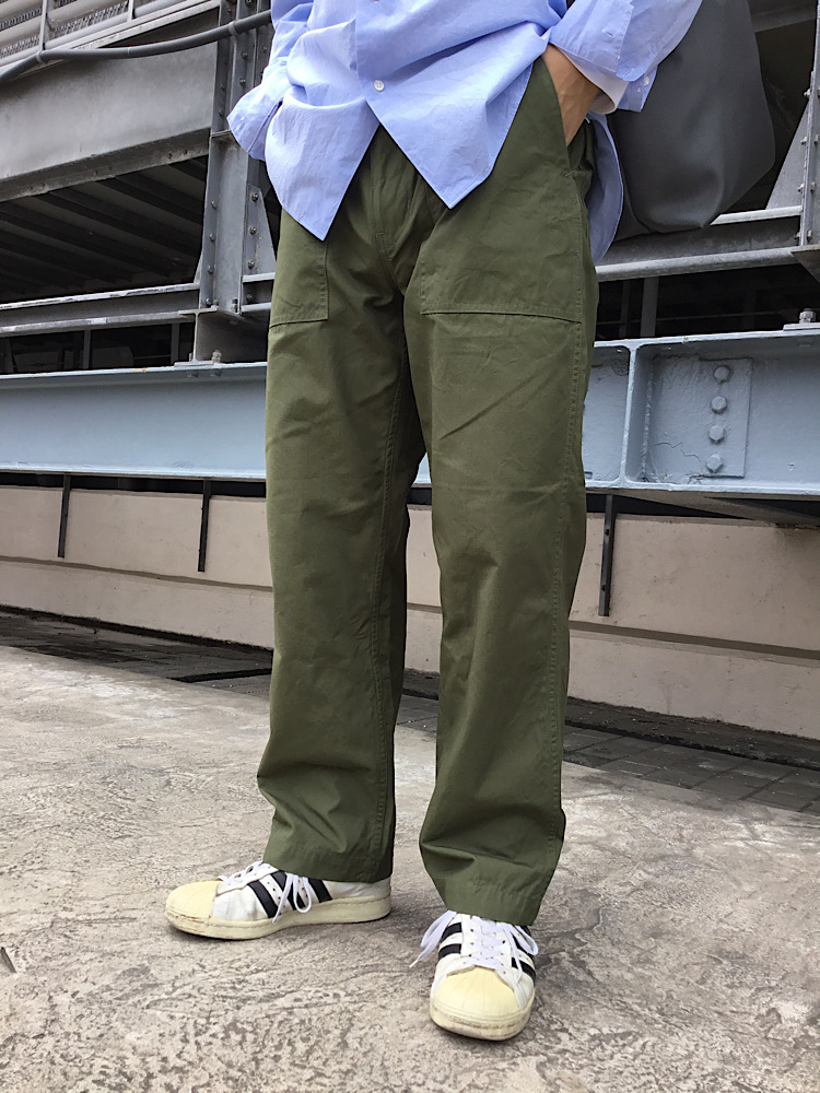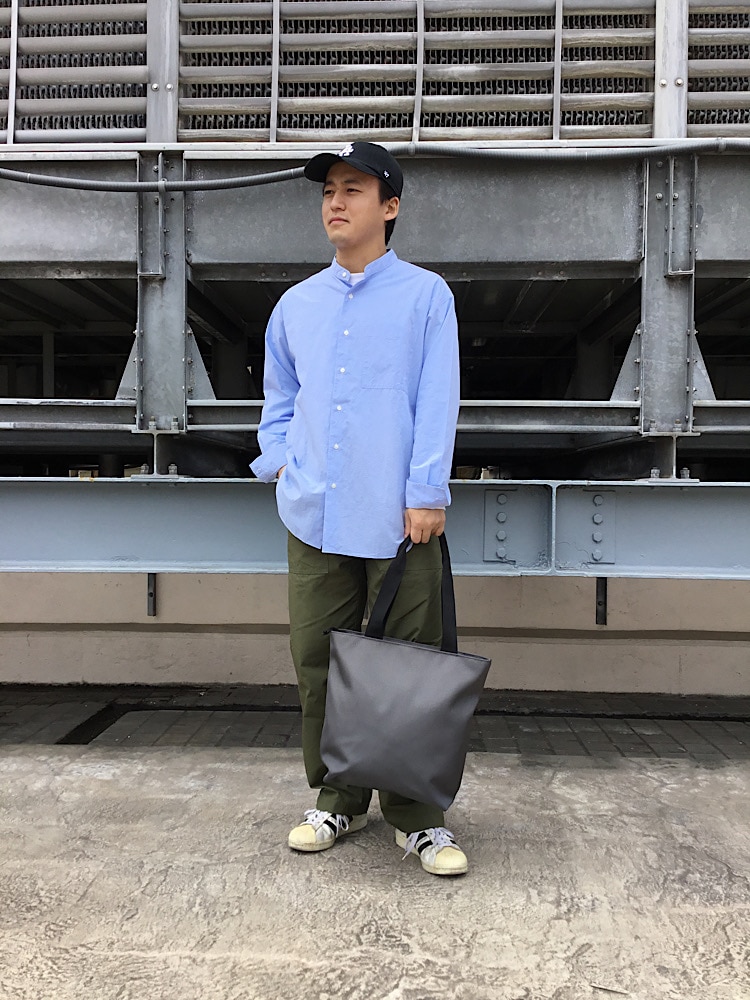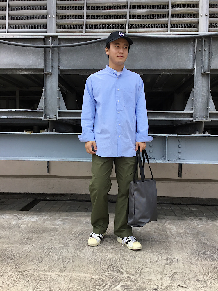 爽やかな色味のバンドカラーシャツと、ミリタリーパンツを使ったコーディネートです。色味が爽やかな為、春〜夏にオススメです。