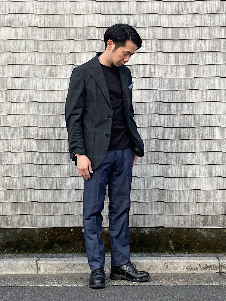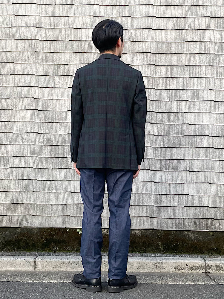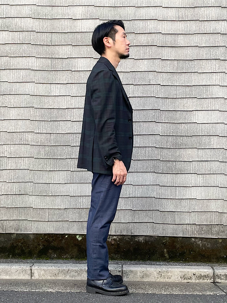 チェック柄のジャケパンコーディネート。