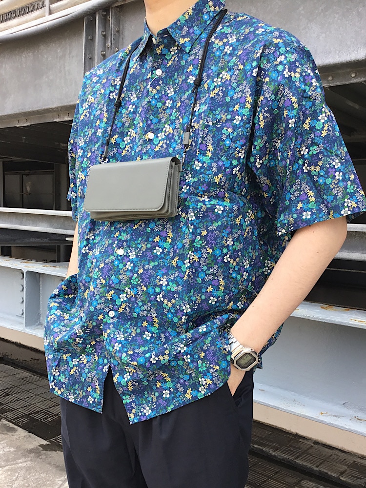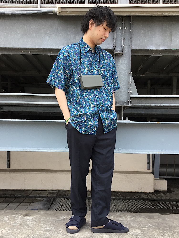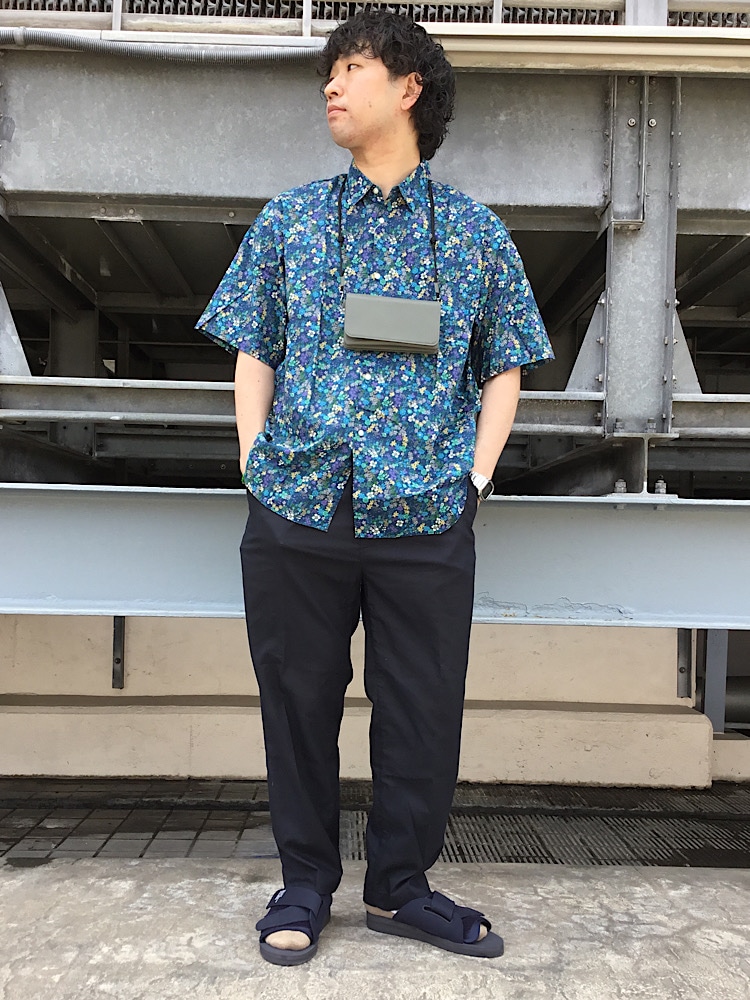 今回は花柄のレギュラー半袖シャツにリネンのワイドパンツを合わせました。小花柄なので初めて花柄を着る方にもおすすめです!